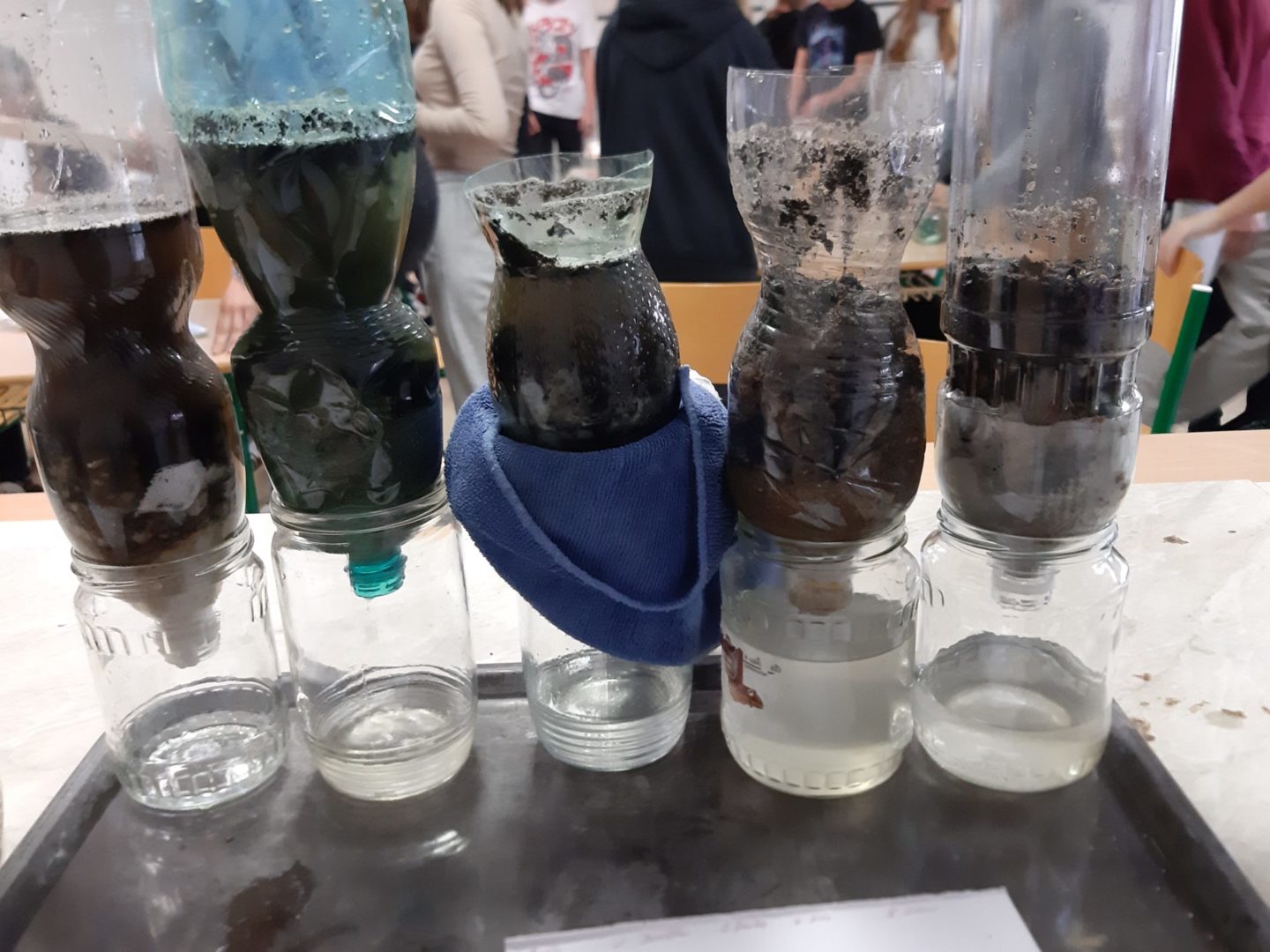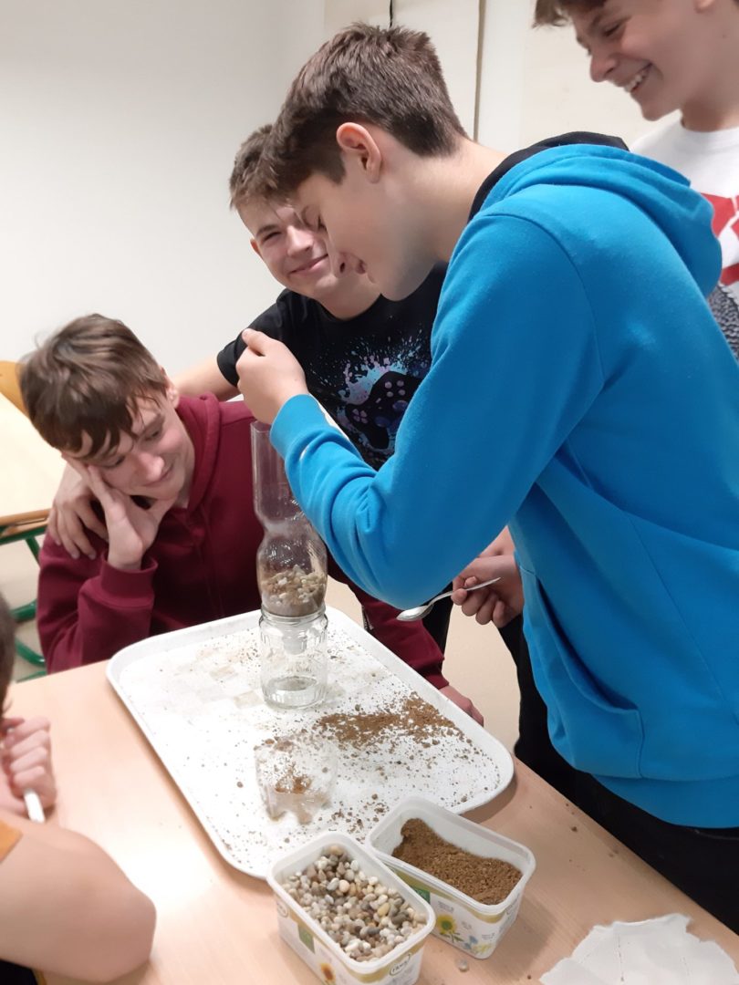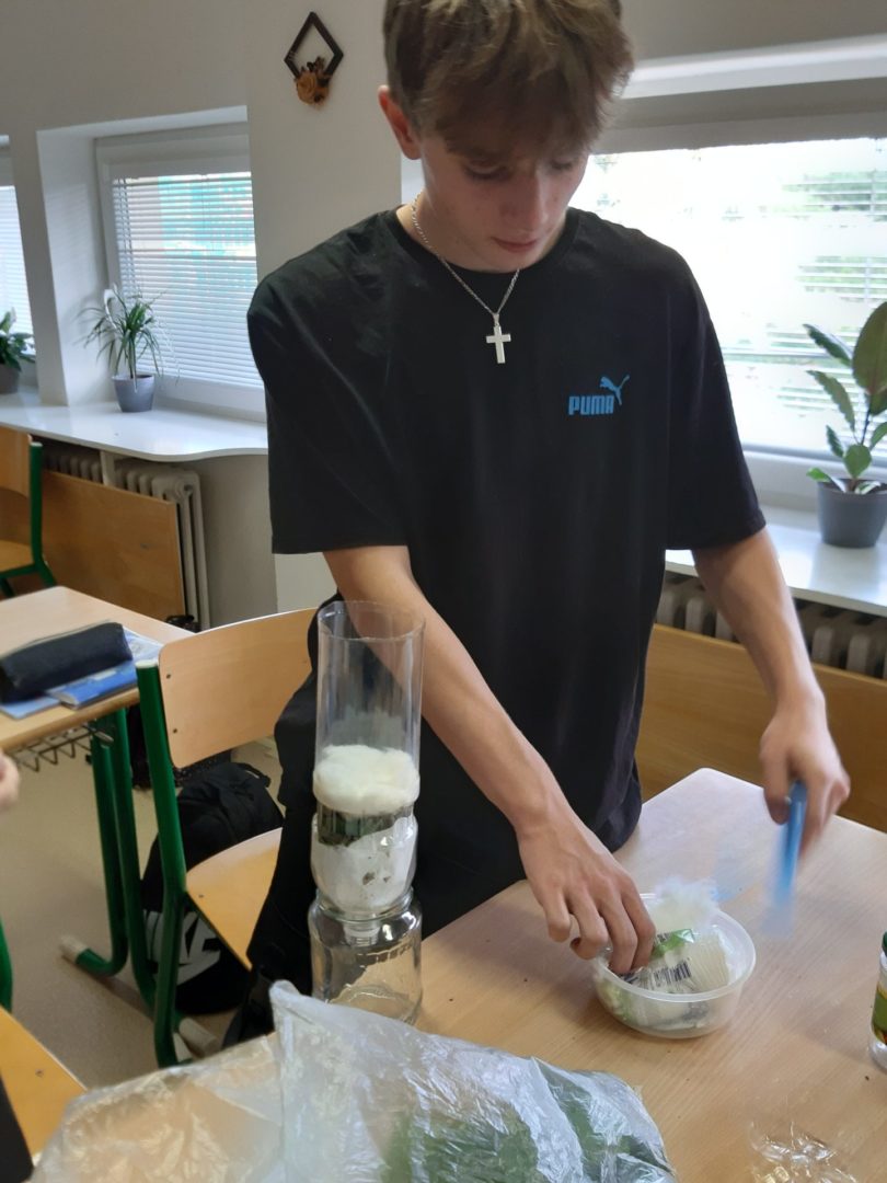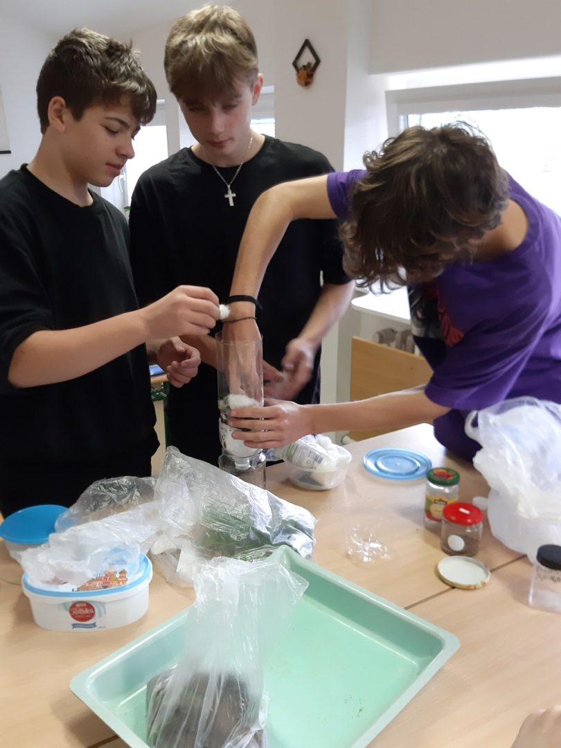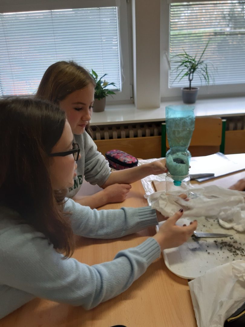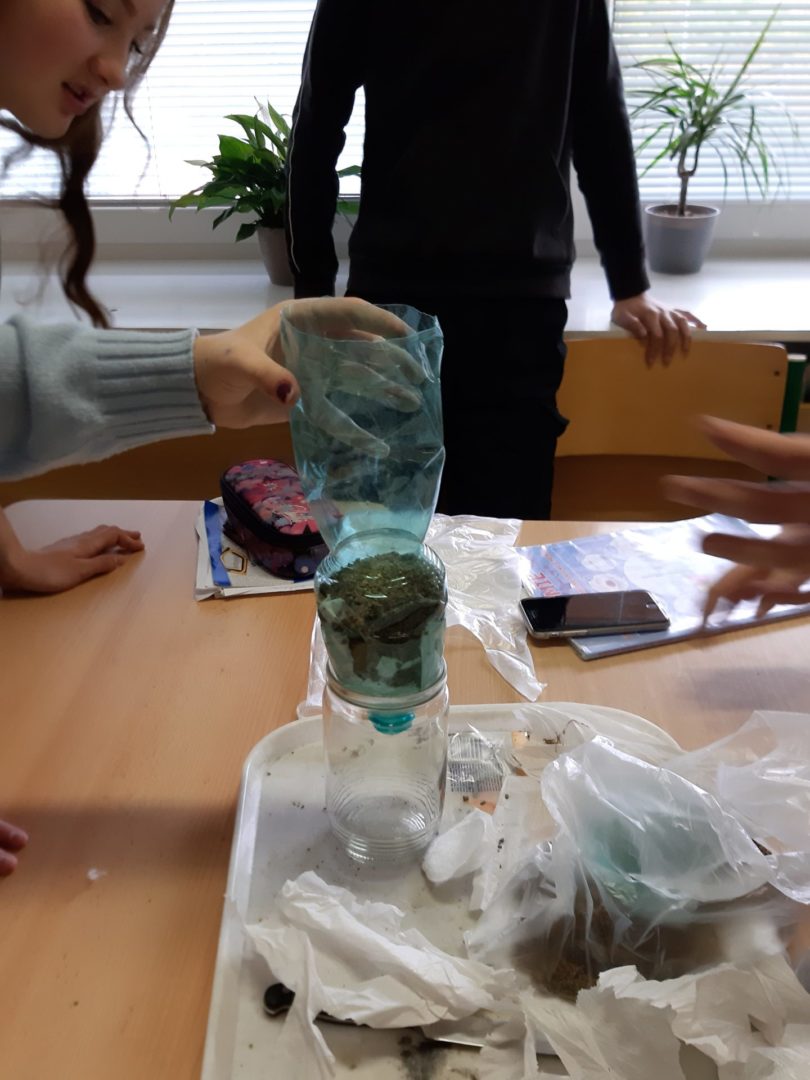 Jako čistící filtry využili různé materiály, které si přinesli z domu. Žáci byli velmi kreativní a překvapili výběrem přírodních i vyrobených látek. Některé skupinky se snažily co nejvíc napodobit čištění vod v přírodě nebo v čistírně odpadních vod a použily ke zhotovení filtračního lože jen písek, štěrk, listí nebo rostliny. Vynalézaví žáci se nebáli proložit přírodní vrstvy vatovými tampony, ubrousky, utěrkou na nádobí nebo rouškou. Ve skupinkách pak promýšleli, jak jednotlivé materiály vršit, tak, aby čištění vody bylo co nejlepší. Účinnost filtrů nakonec prověřila hrubě znečištěná směs vody a zeminy.