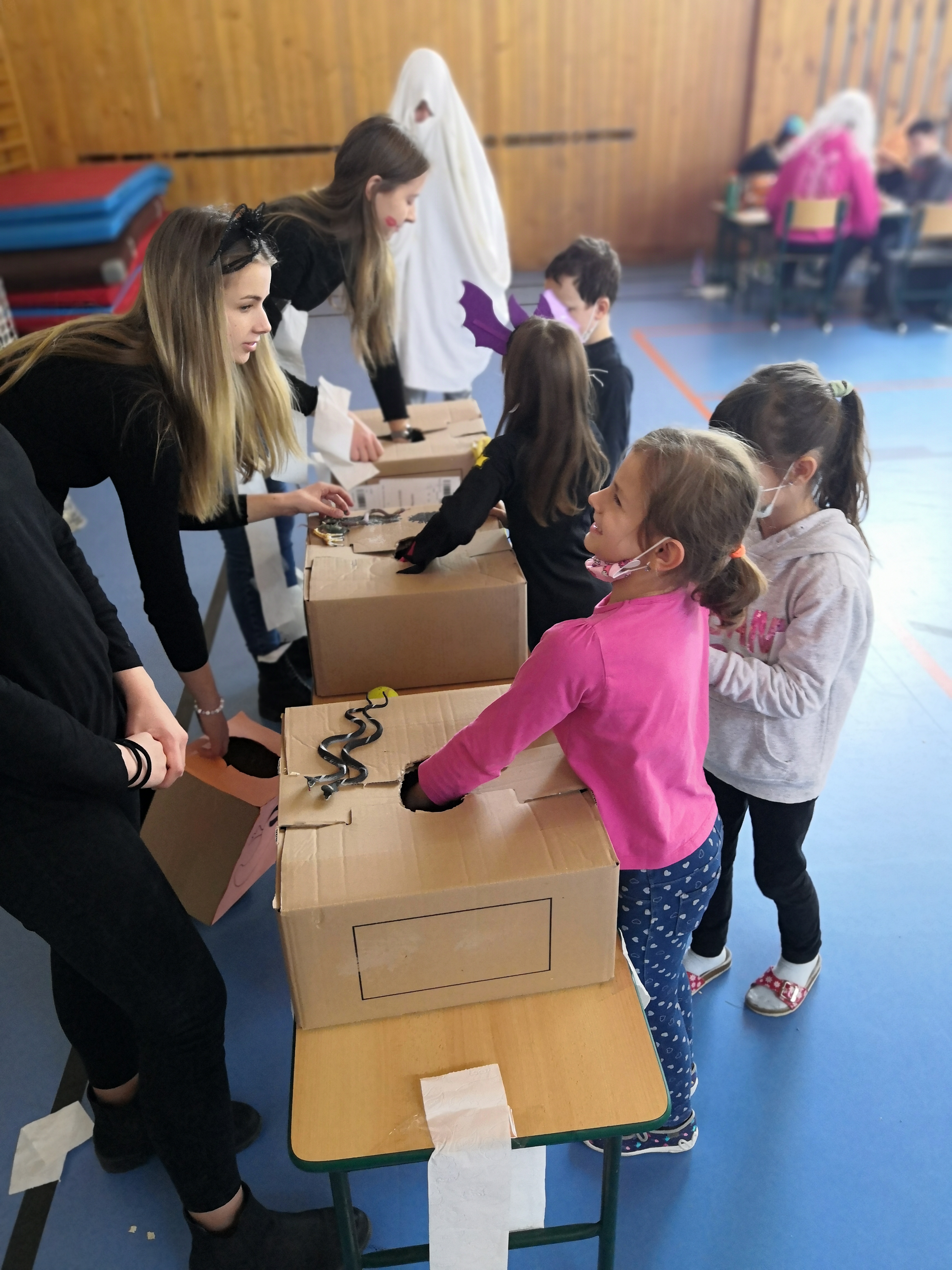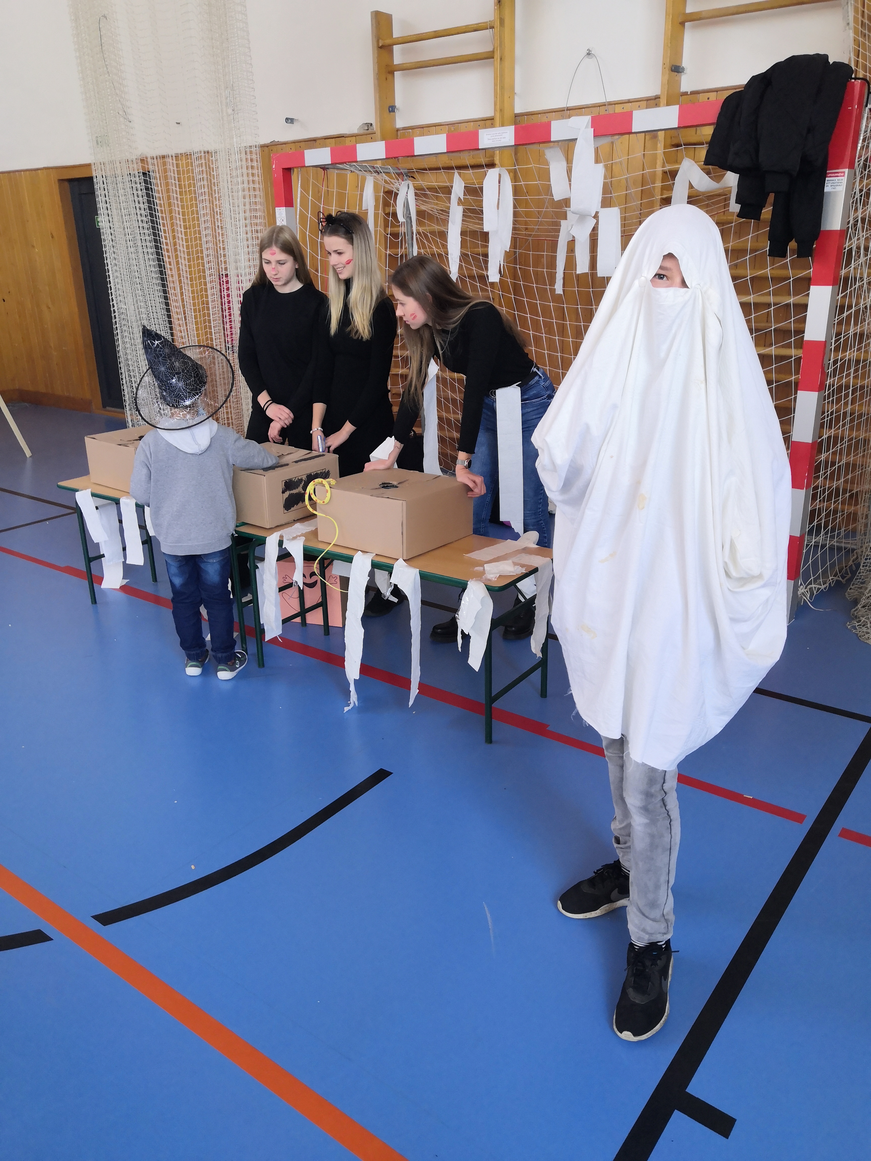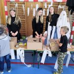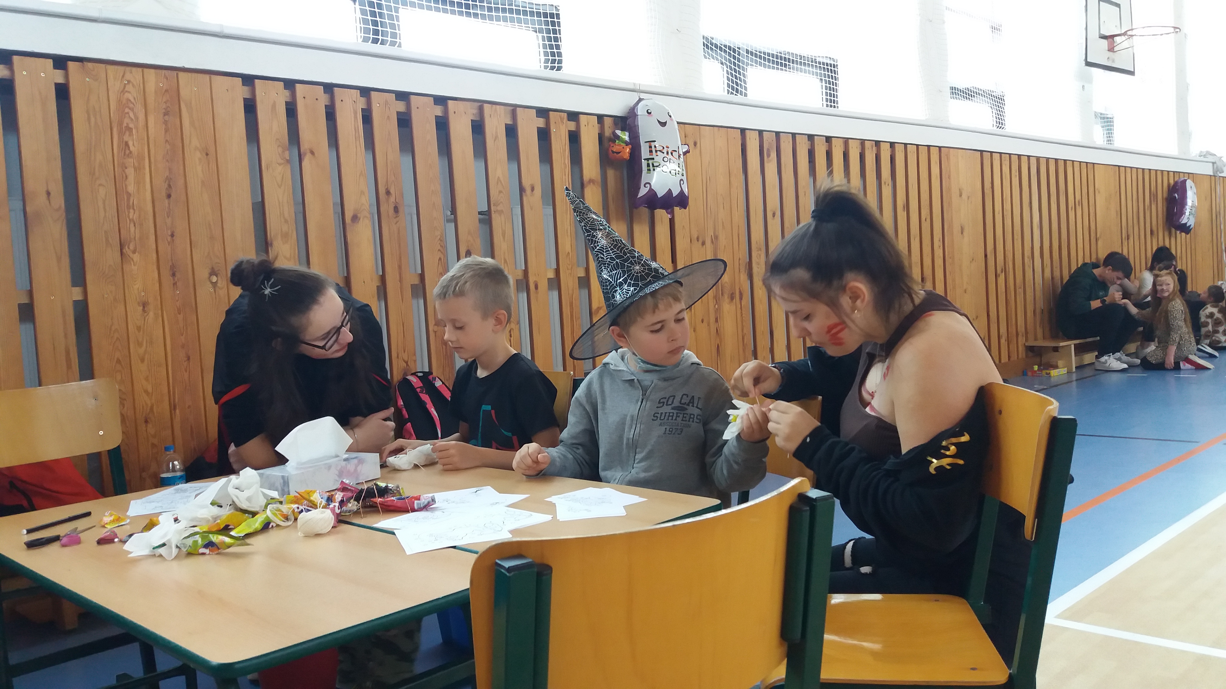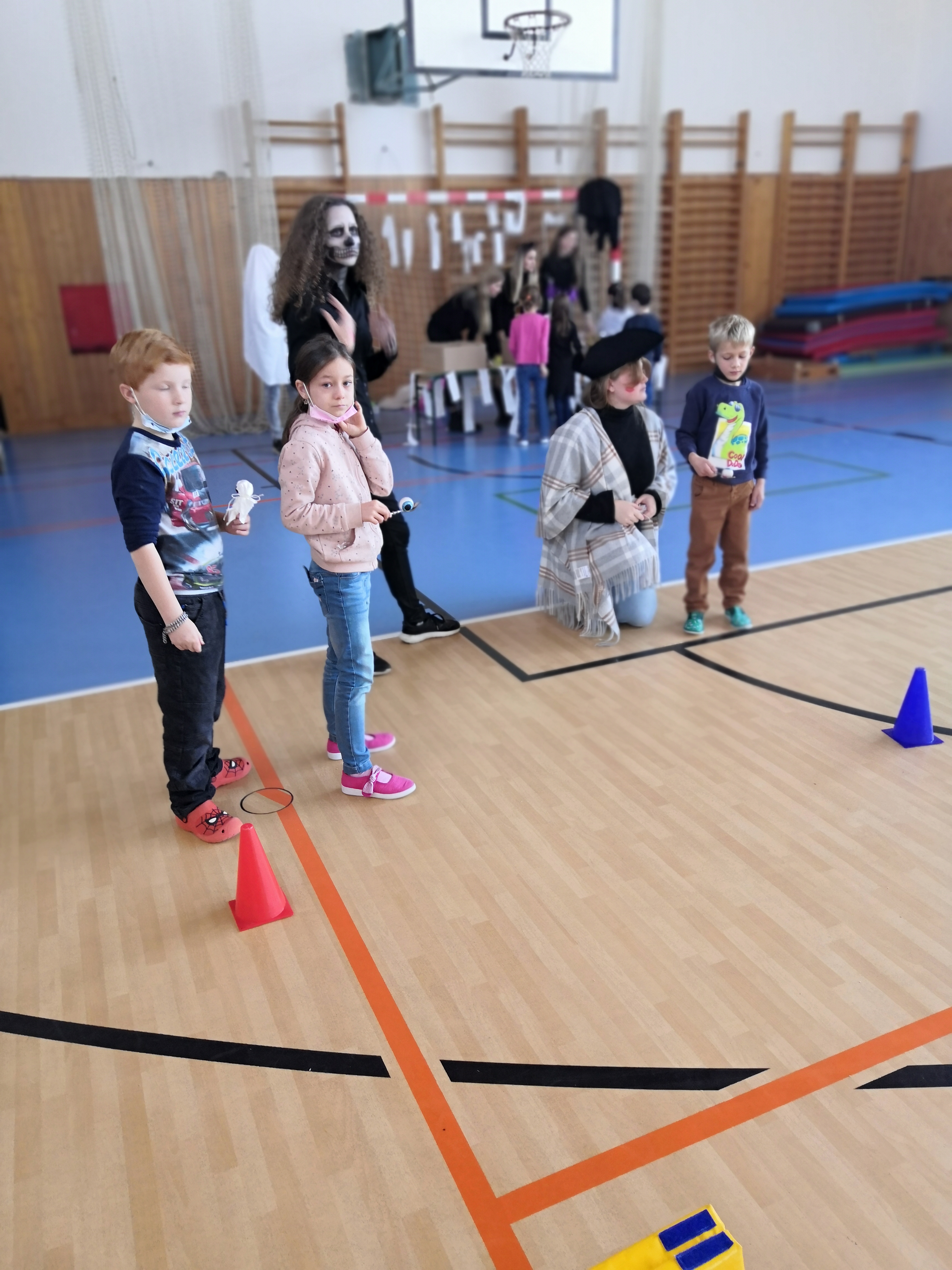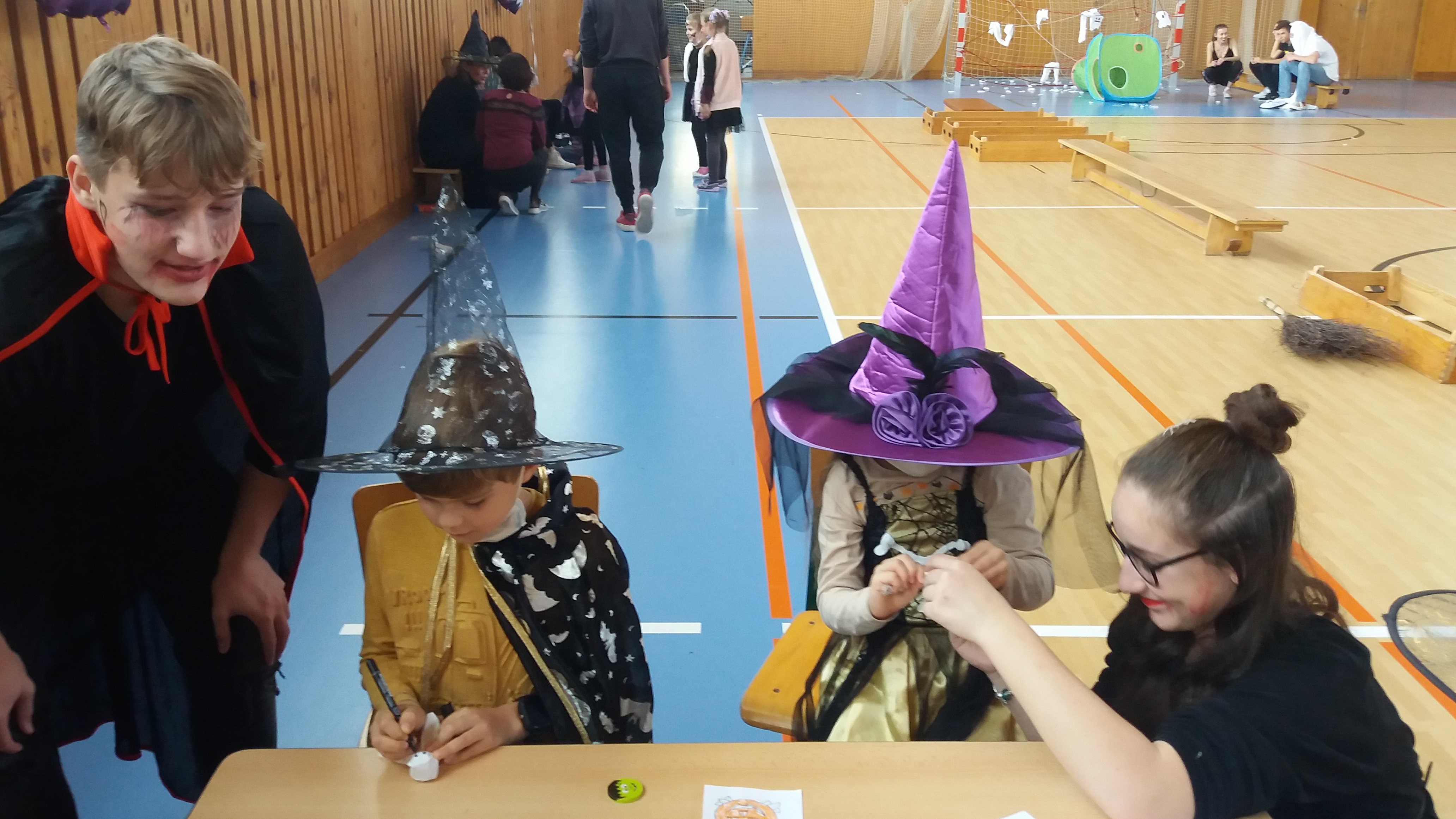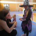 V tělocvičně jsme si nachystali vše potřebné a v 8:00 se již dostavila třída 1.A, všechny tři první třídy se v tělocvičně postupně vystřídaly. Prvňáci chodili s „okem“ na lžičce slalom, absolvovali opičí dráhu s koštětem, házeli míčky do pusy čarodějnici, lovili strašidelné živočichy (pavouky, krysy a hady) z tajuplných krabic, vymalovávali si halloweenské obrázky a vyráběli duchy z lízátek, prolézali pavučinou, zdobili mandarinky (jakoby malé dýně) a mohli si nechat něco namalovat na obličej. Vypadalo to, že si společně strávený čas užívají jak prvňáci, tak deváťáci.