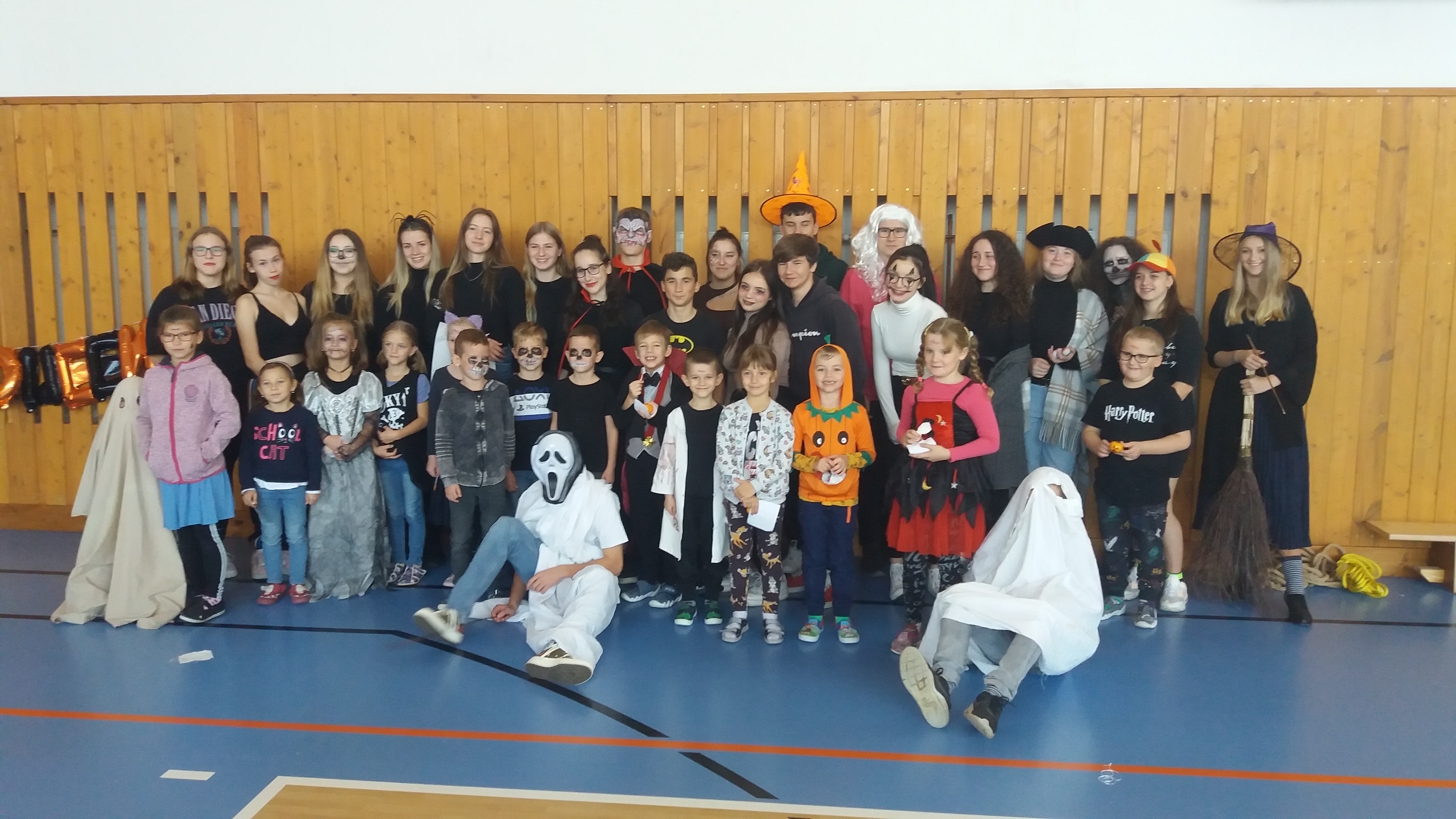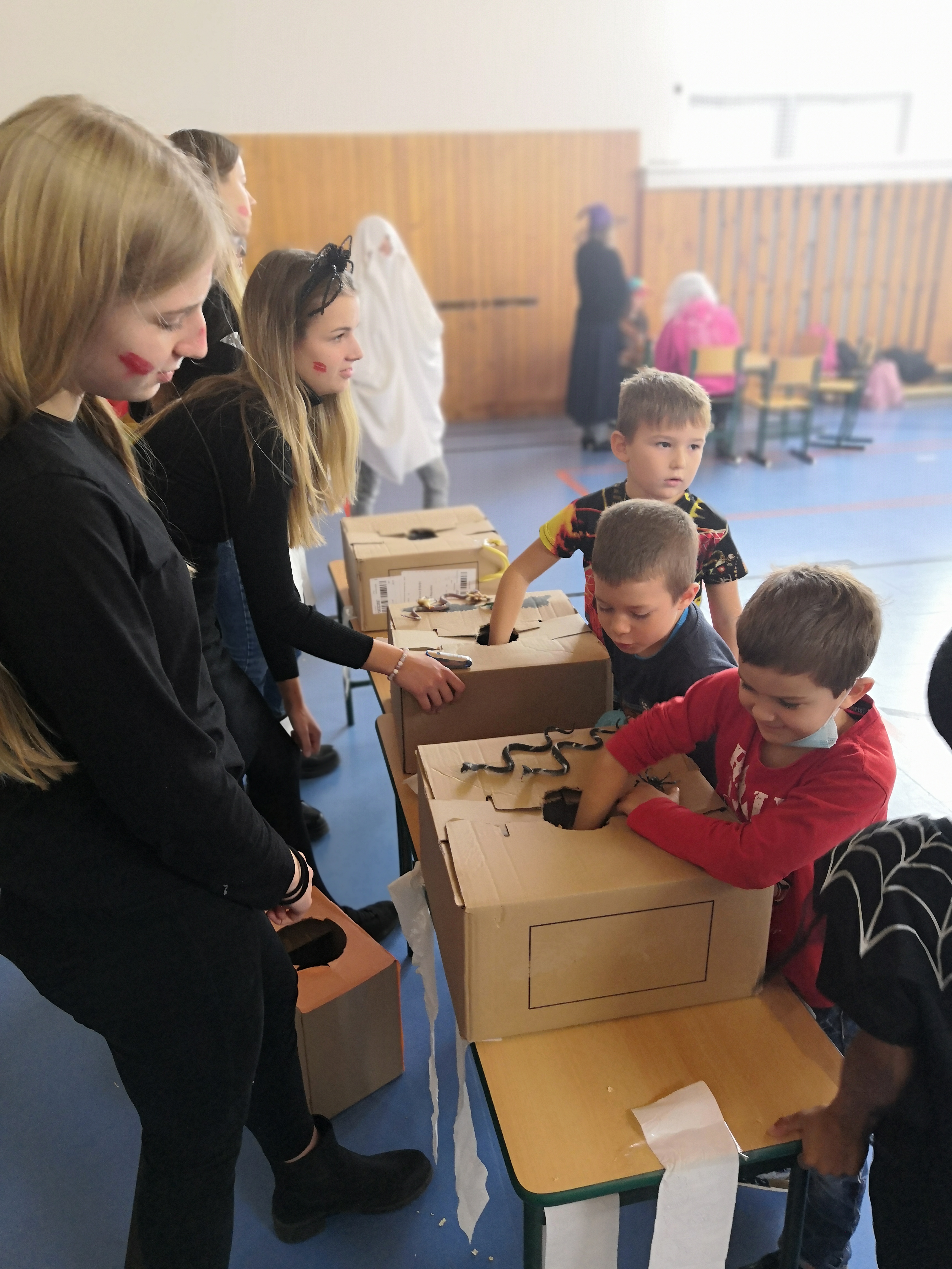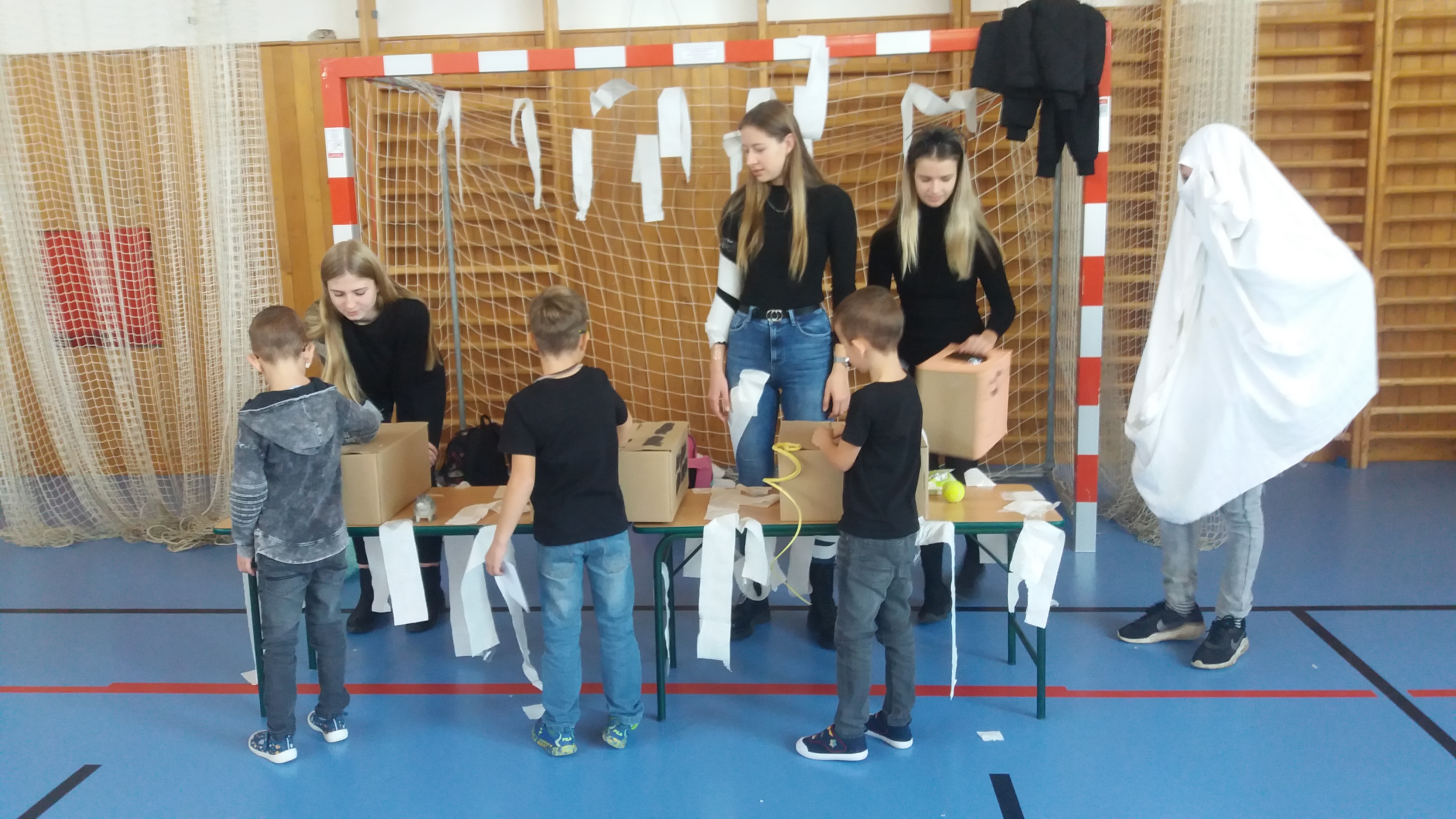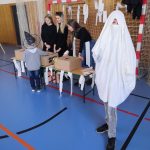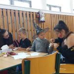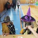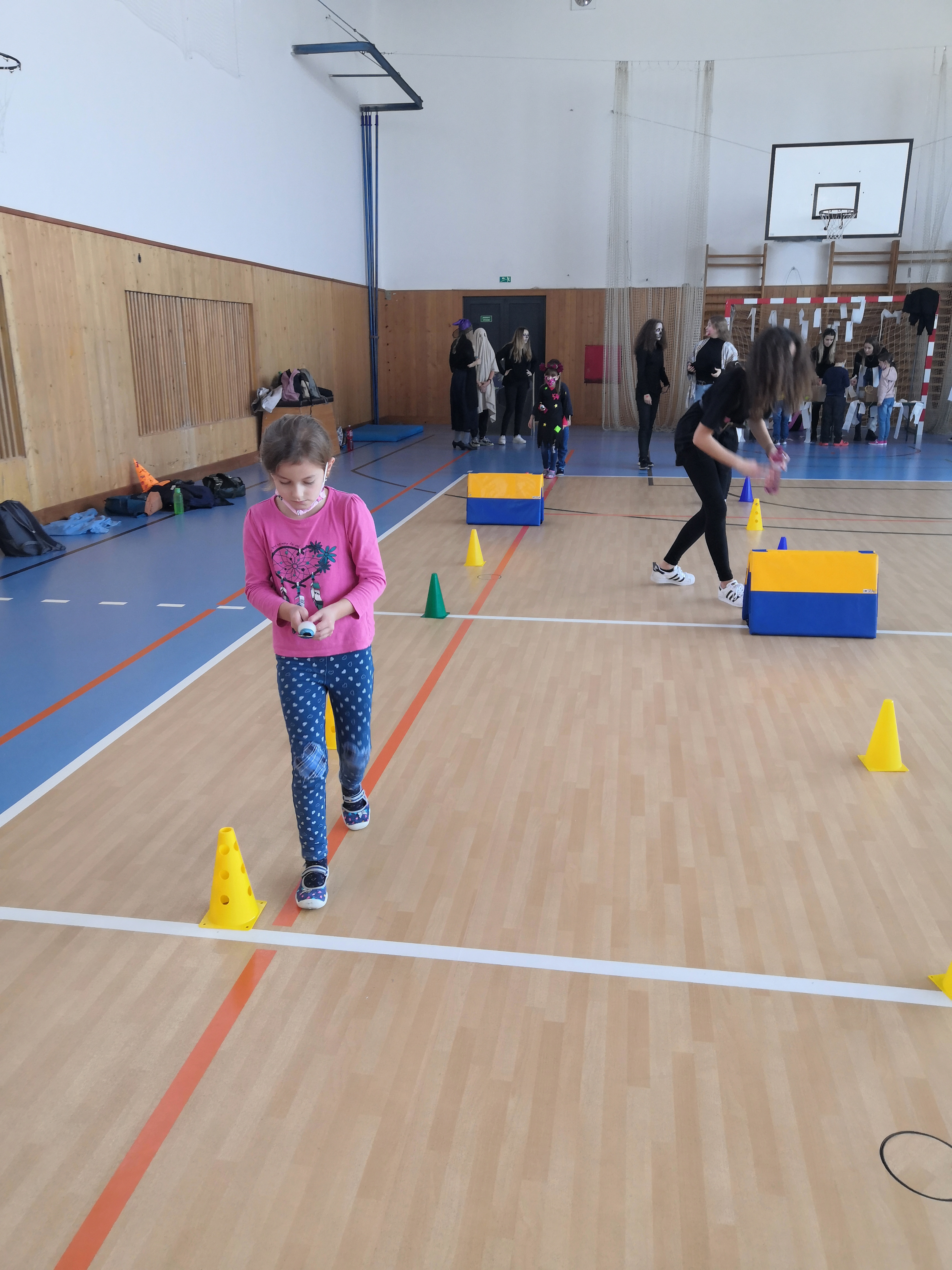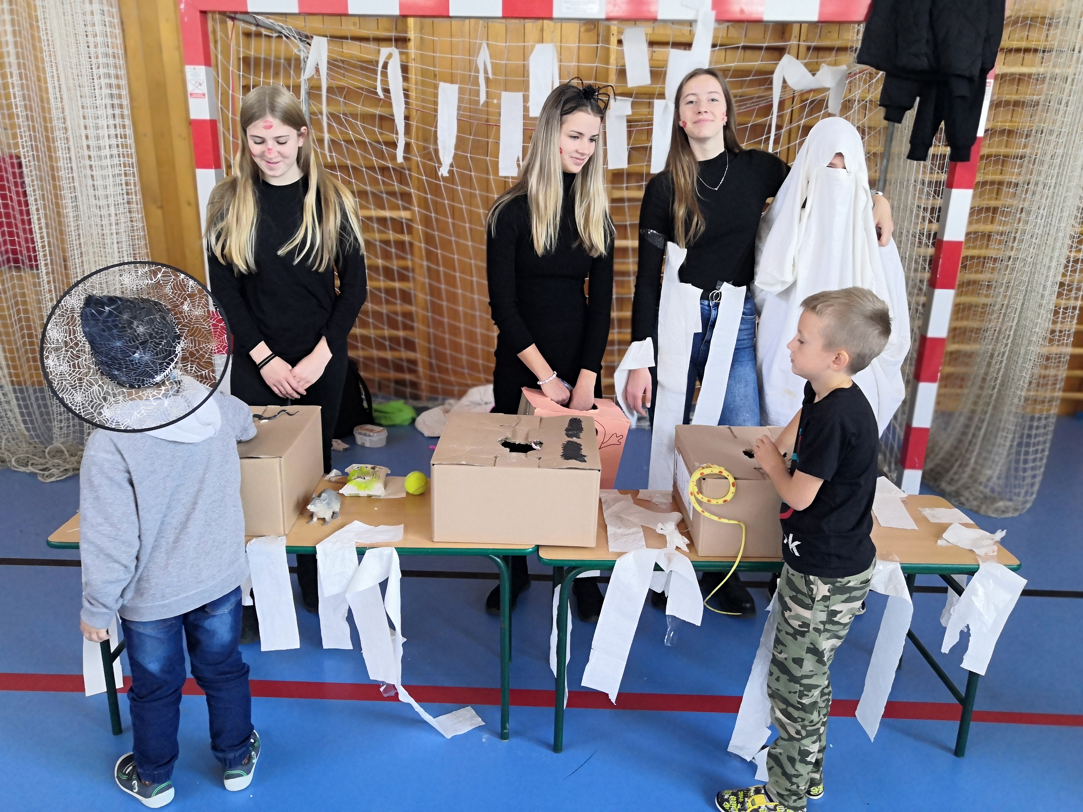 V tělocvičně jsme si nachystali vše potřebné a v 8:00 se již dostavila třída 1.A, všechny tři první třídy se v tělocvičně postupně vystřídaly. Prvňáci chodili s „okem“ na lžičce slalom, absolvovali opičí dráhu s koštětem, házeli míčky do pusy čarodějnici, lovili strašidelné živočichy (pavouky, krysy a hady) z tajuplných krabic, vymalovávali si halloweenské obrázky a vyráběli duchy z lízátek, prolézali pavučinou, zdobili mandarinky (jakoby malé dýně) a mohli si nechat něco namalovat na obličej. Vypadalo to, že si společně strávený čas užívají jak prvňáci, tak deváťáci.