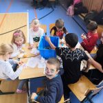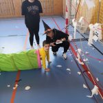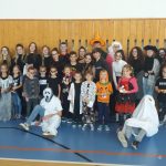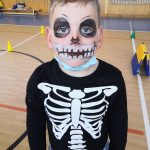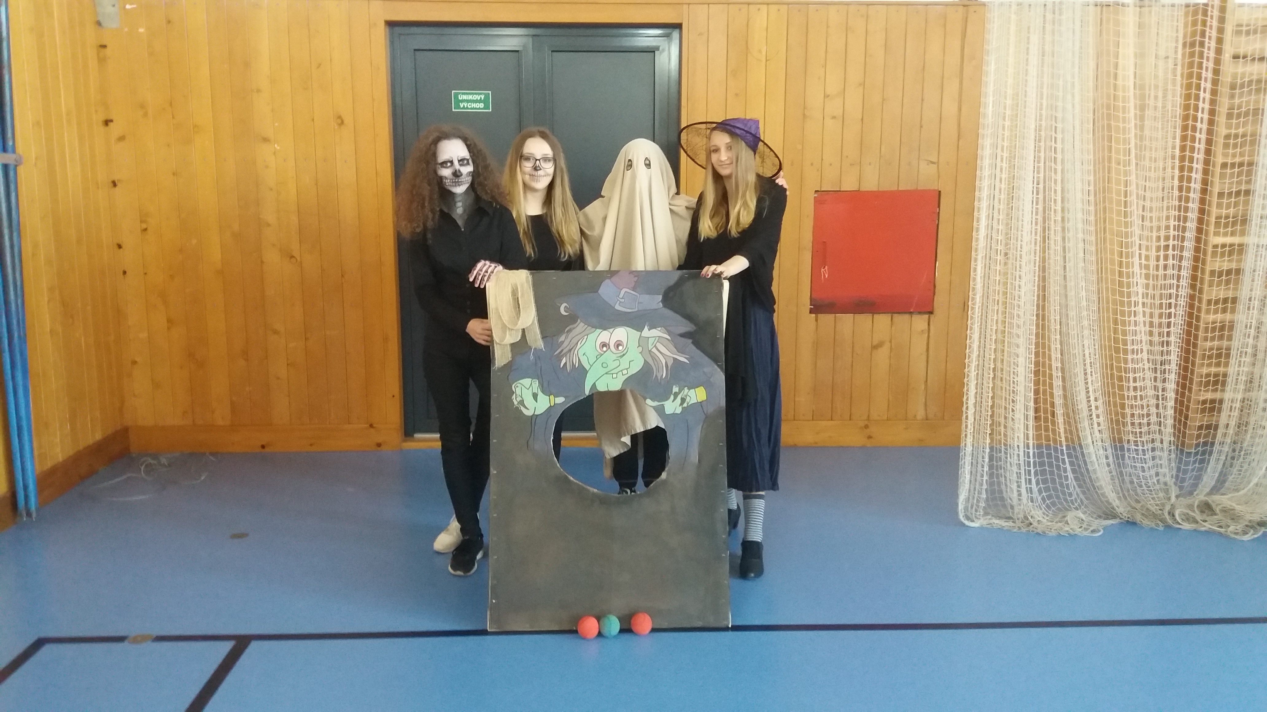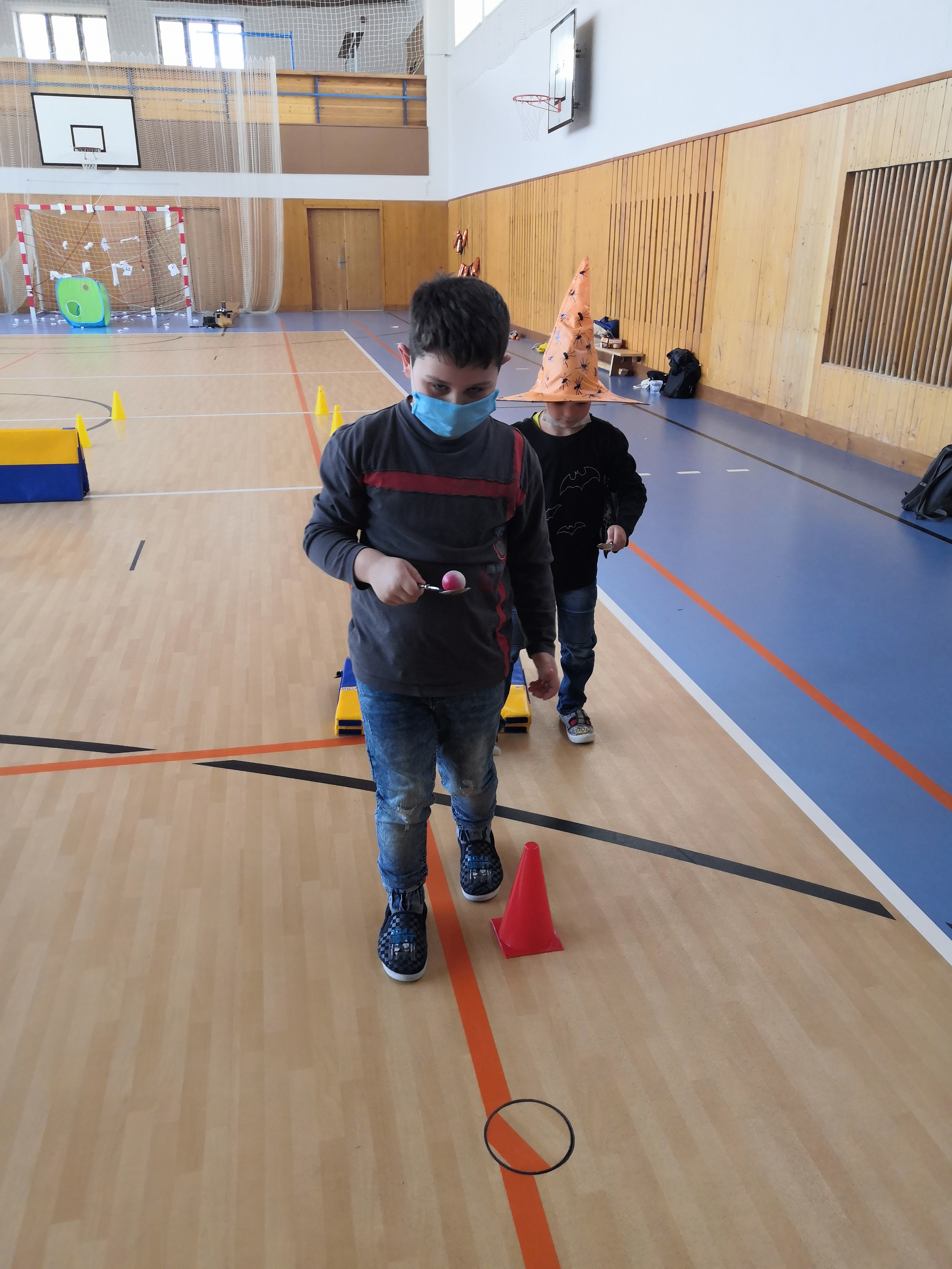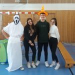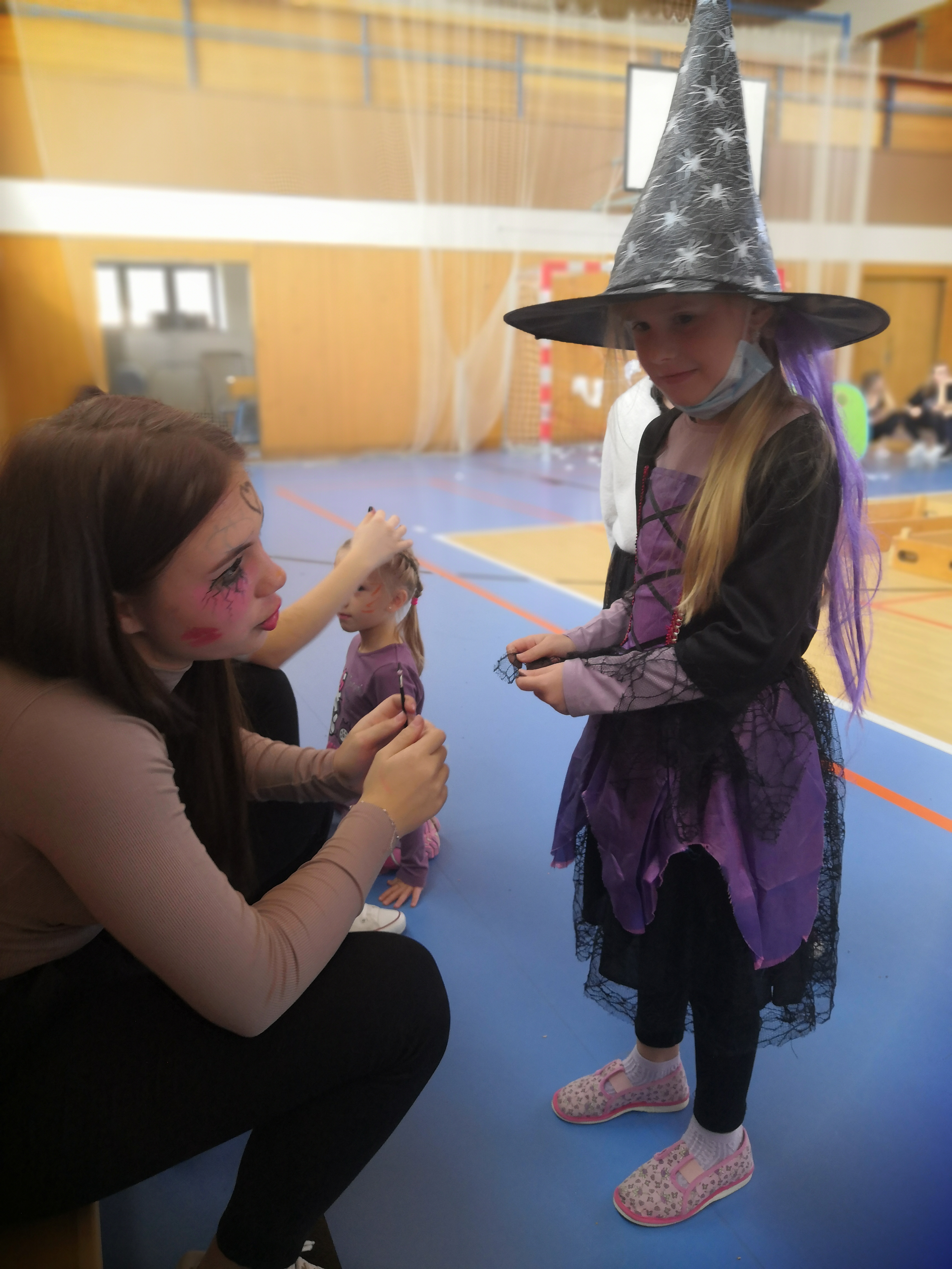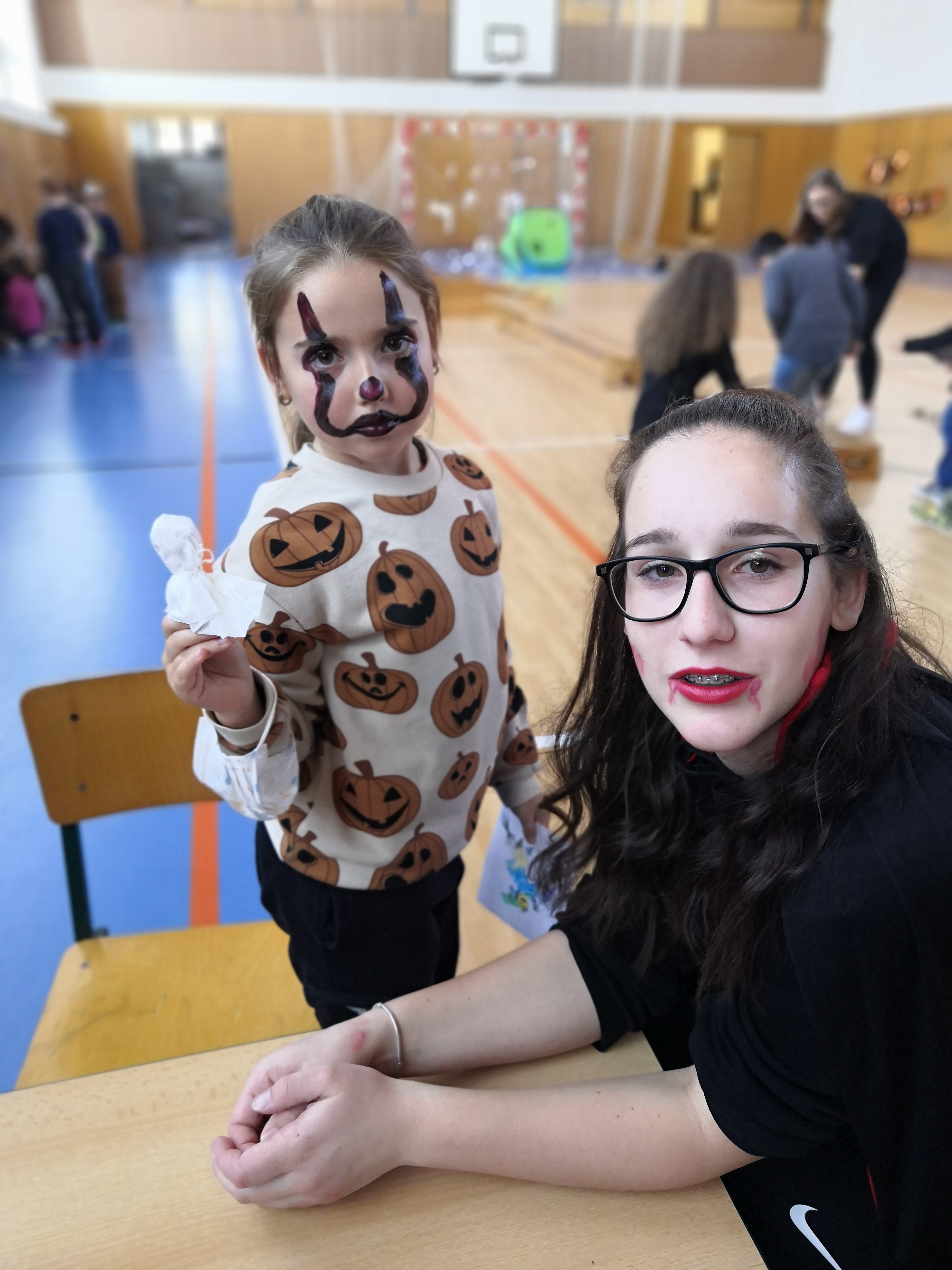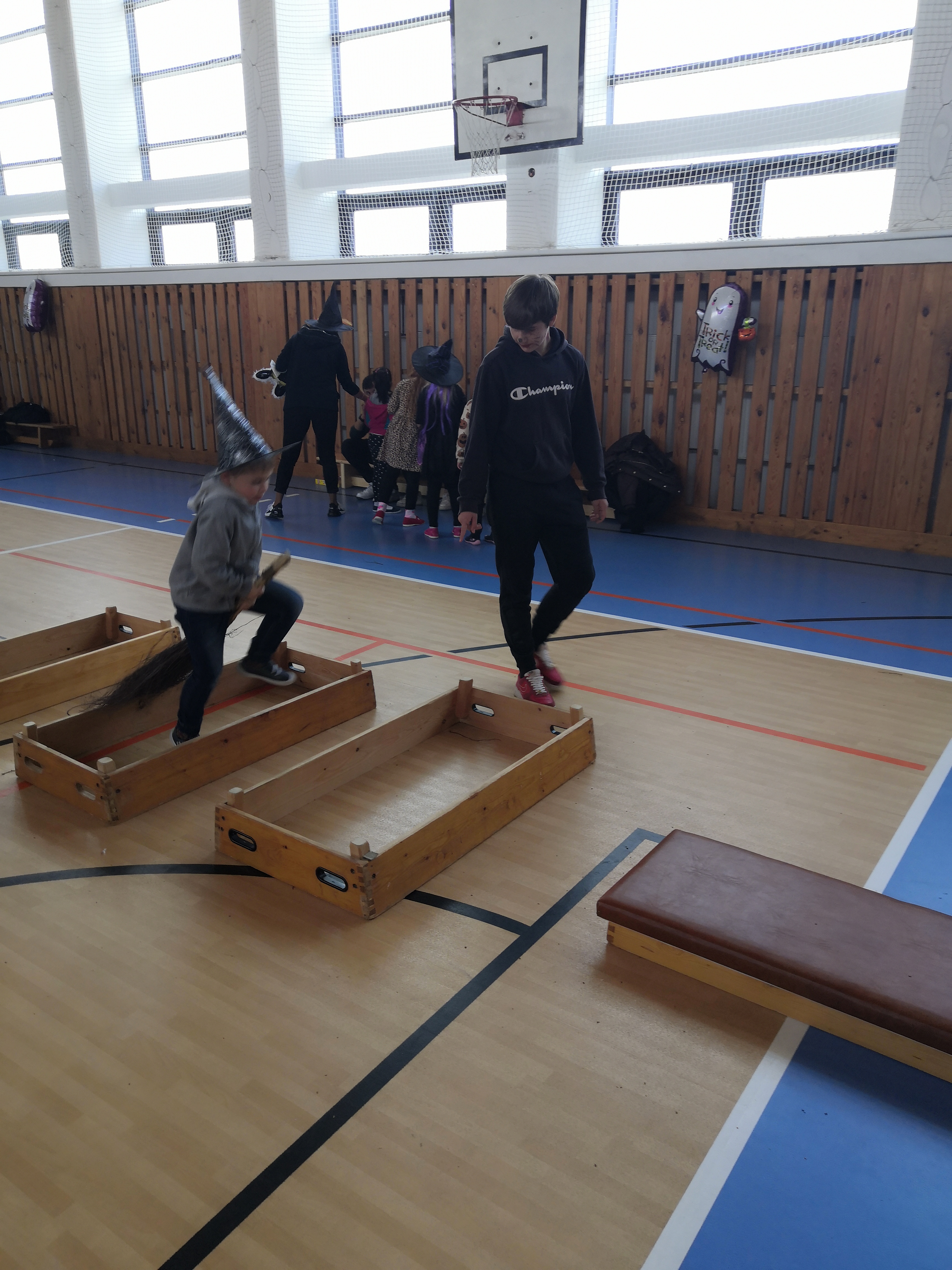 V tělocvičně jsme si nachystali vše potřebné a v 8:00 se již dostavila třída 1.A, všechny tři první třídy se v tělocvičně postupně vystřídaly. Prvňáci chodili s „okem“ na lžičce slalom, absolvovali opičí dráhu s koštětem, házeli míčky do pusy čarodějnici, lovili strašidelné živočichy (pavouky, krysy a hady) z tajuplných krabic, vymalovávali si halloweenské obrázky a vyráběli duchy z lízátek, prolézali pavučinou, zdobili mandarinky (jakoby malé dýně) a mohli si nechat něco namalovat na obličej. Vypadalo to, že si společně strávený čas užívají jak prvňáci, tak deváťáci.