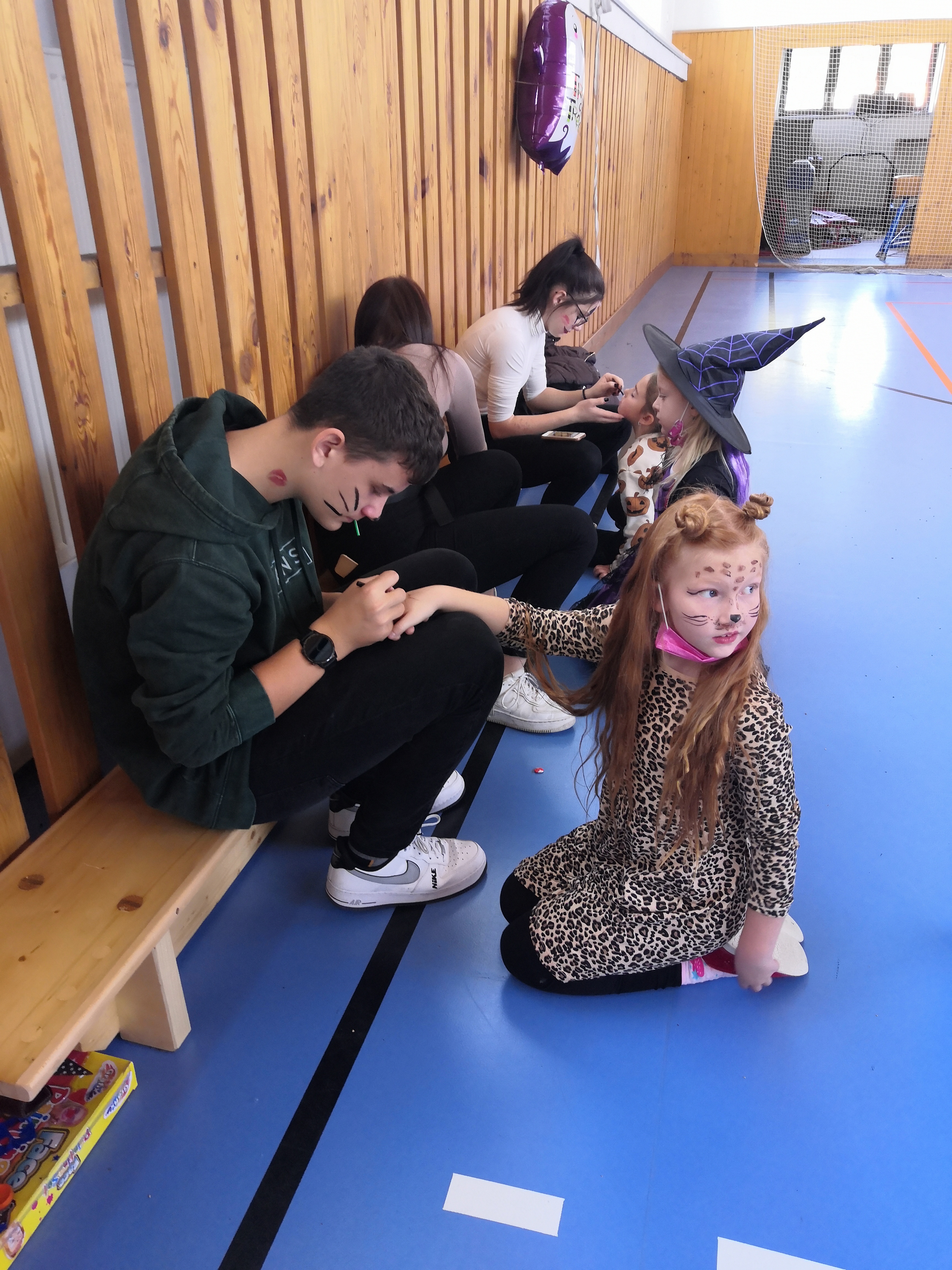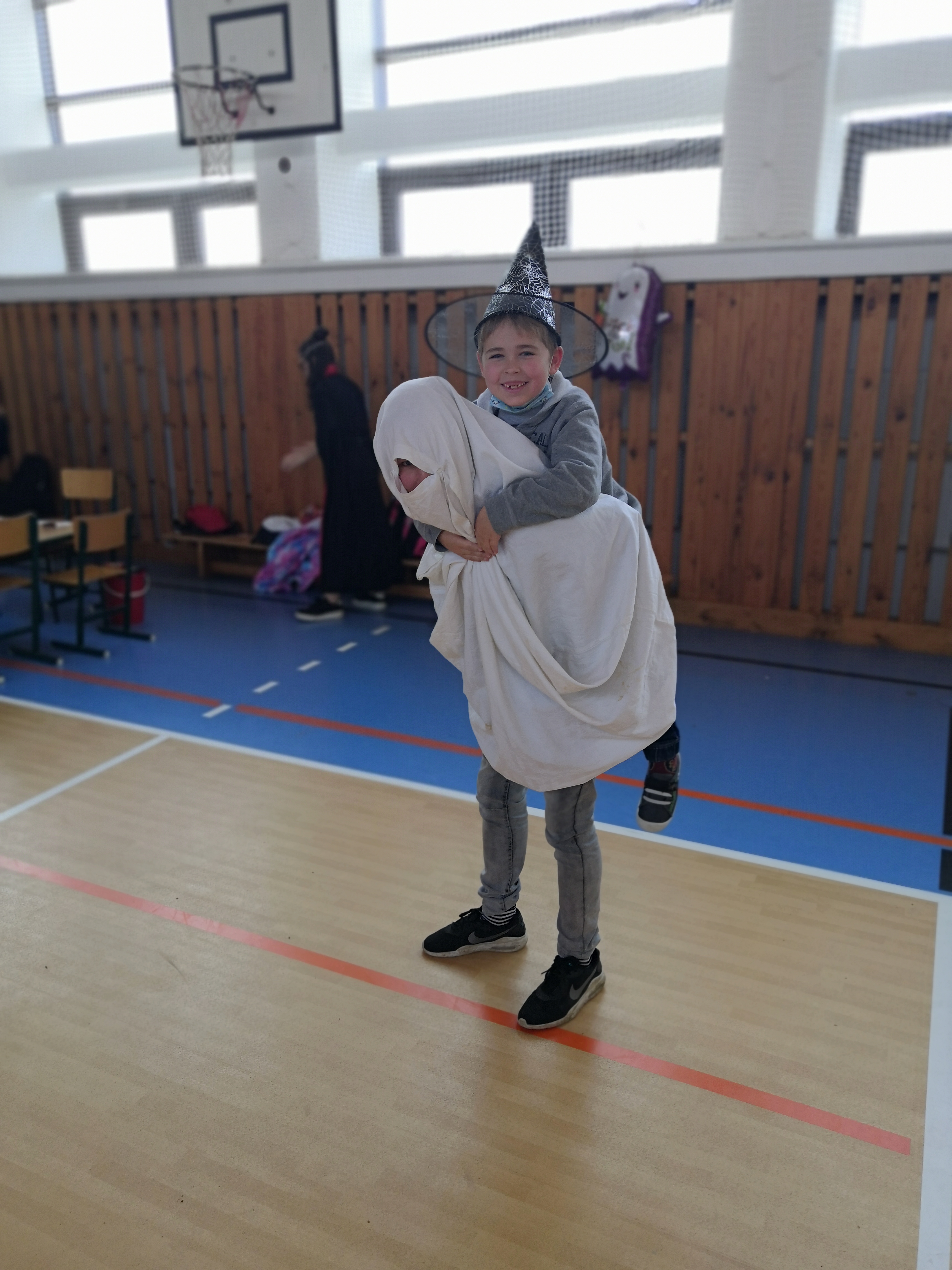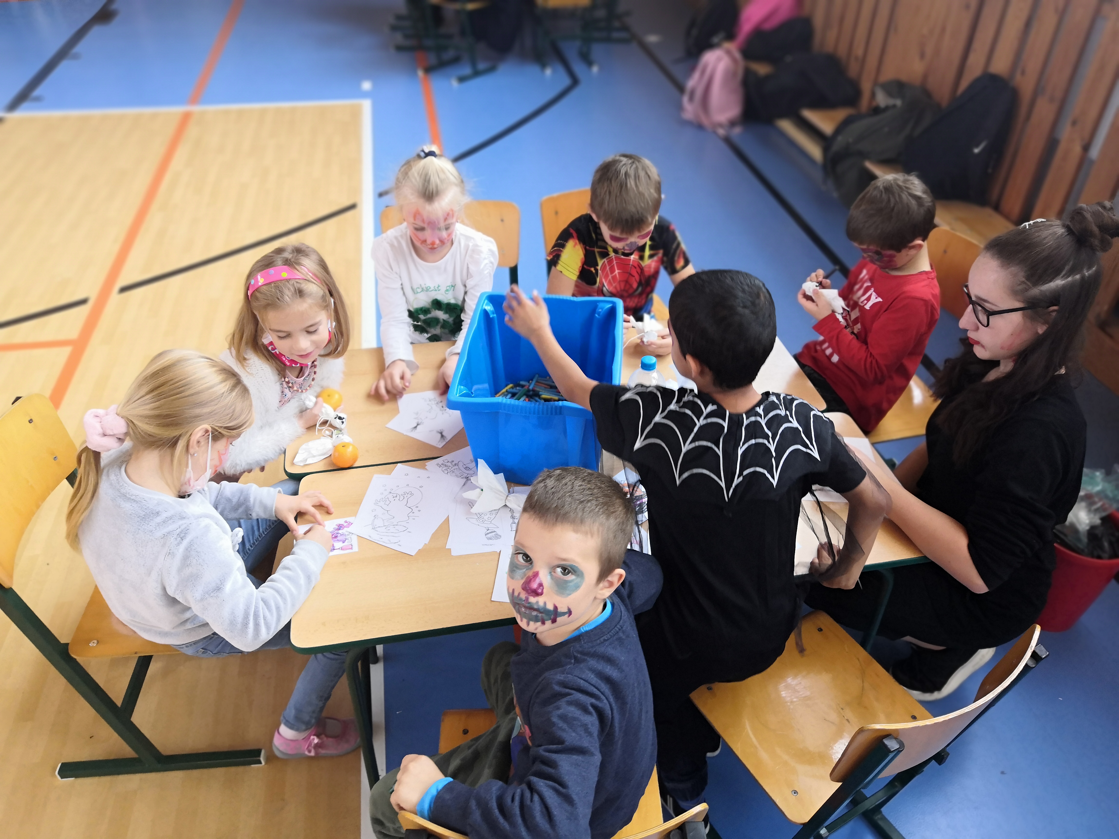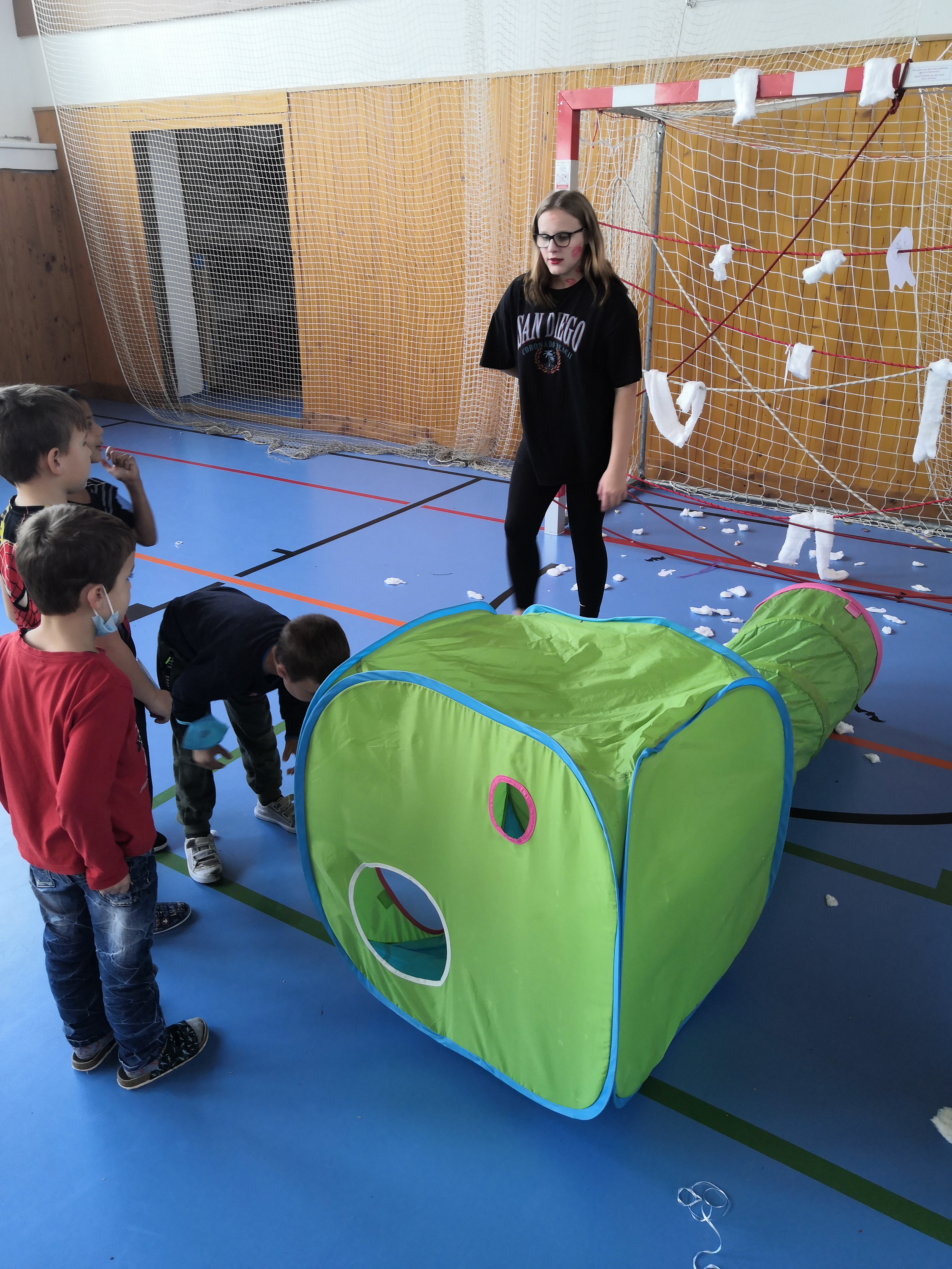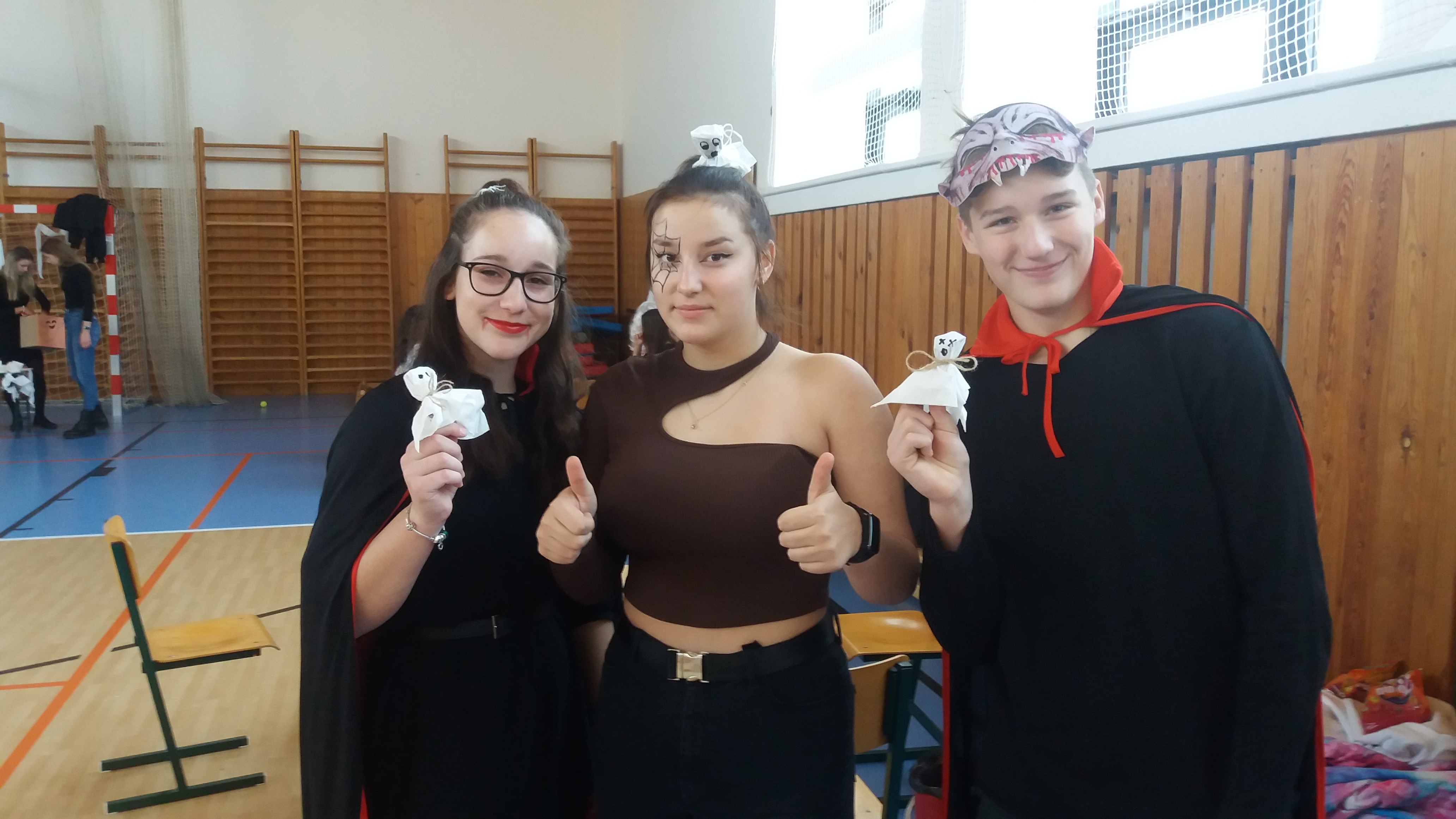 V tělocvičně jsme si nachystali vše potřebné a v 8:00 se již dostavila třída 1.A, všechny tři první třídy se v tělocvičně postupně vystřídaly. Prvňáci chodili s „okem“ na lžičce slalom, absolvovali opičí dráhu s koštětem, házeli míčky do pusy čarodějnici, lovili strašidelné živočichy (pavouky, krysy a hady) z tajuplných krabic, vymalovávali si halloweenské obrázky a vyráběli duchy z lízátek, prolézali pavučinou, zdobili mandarinky (jakoby malé dýně) a mohli si nechat něco namalovat na obličej. Vypadalo to, že si společně strávený čas užívají jak prvňáci, tak deváťáci.
