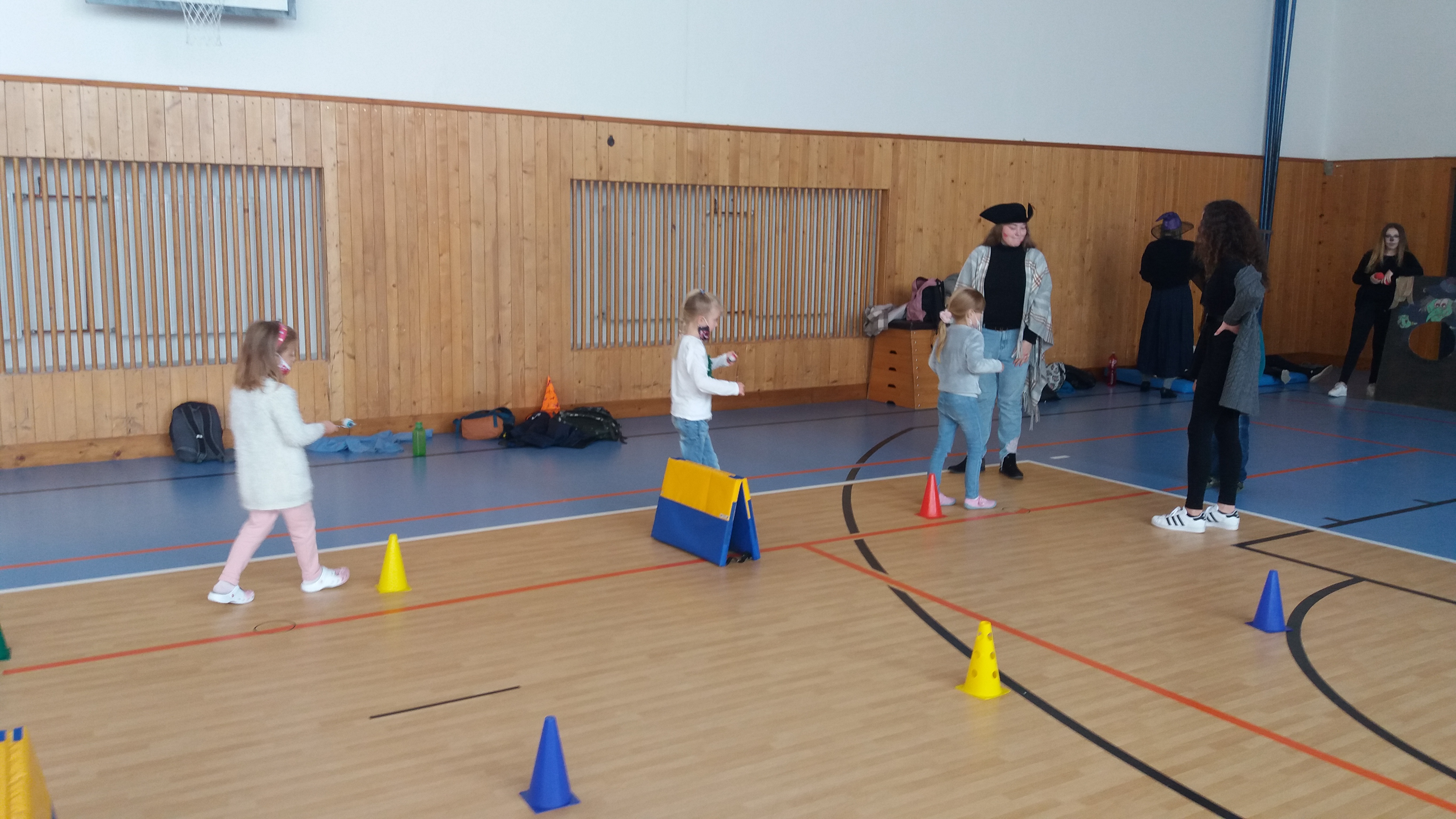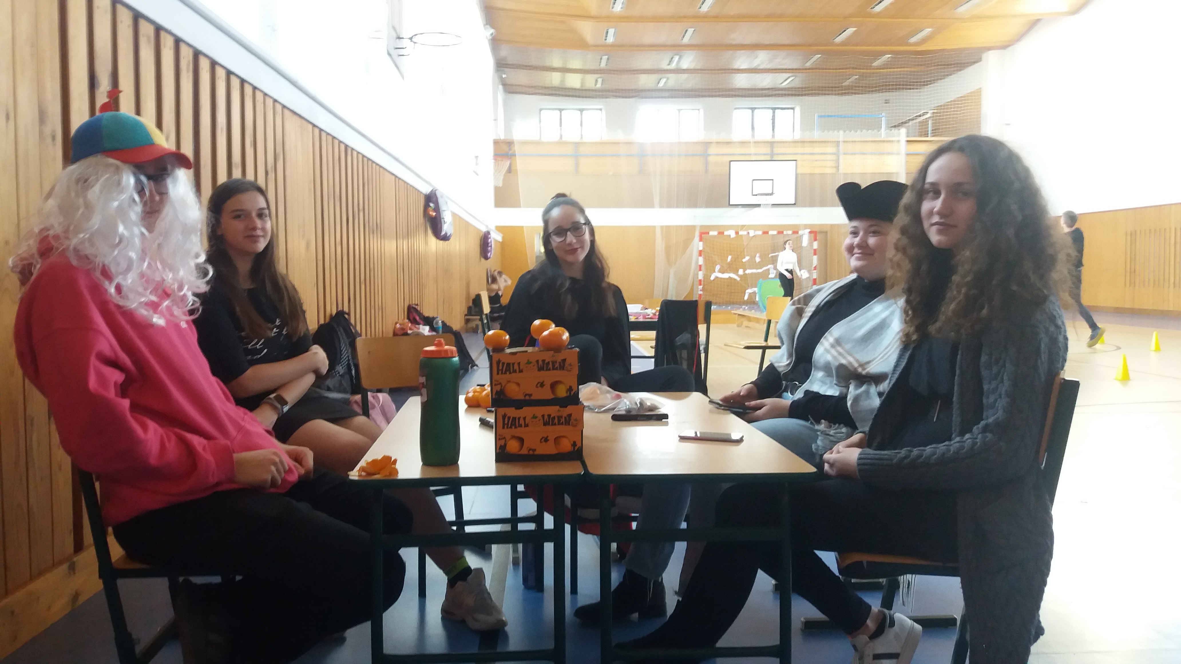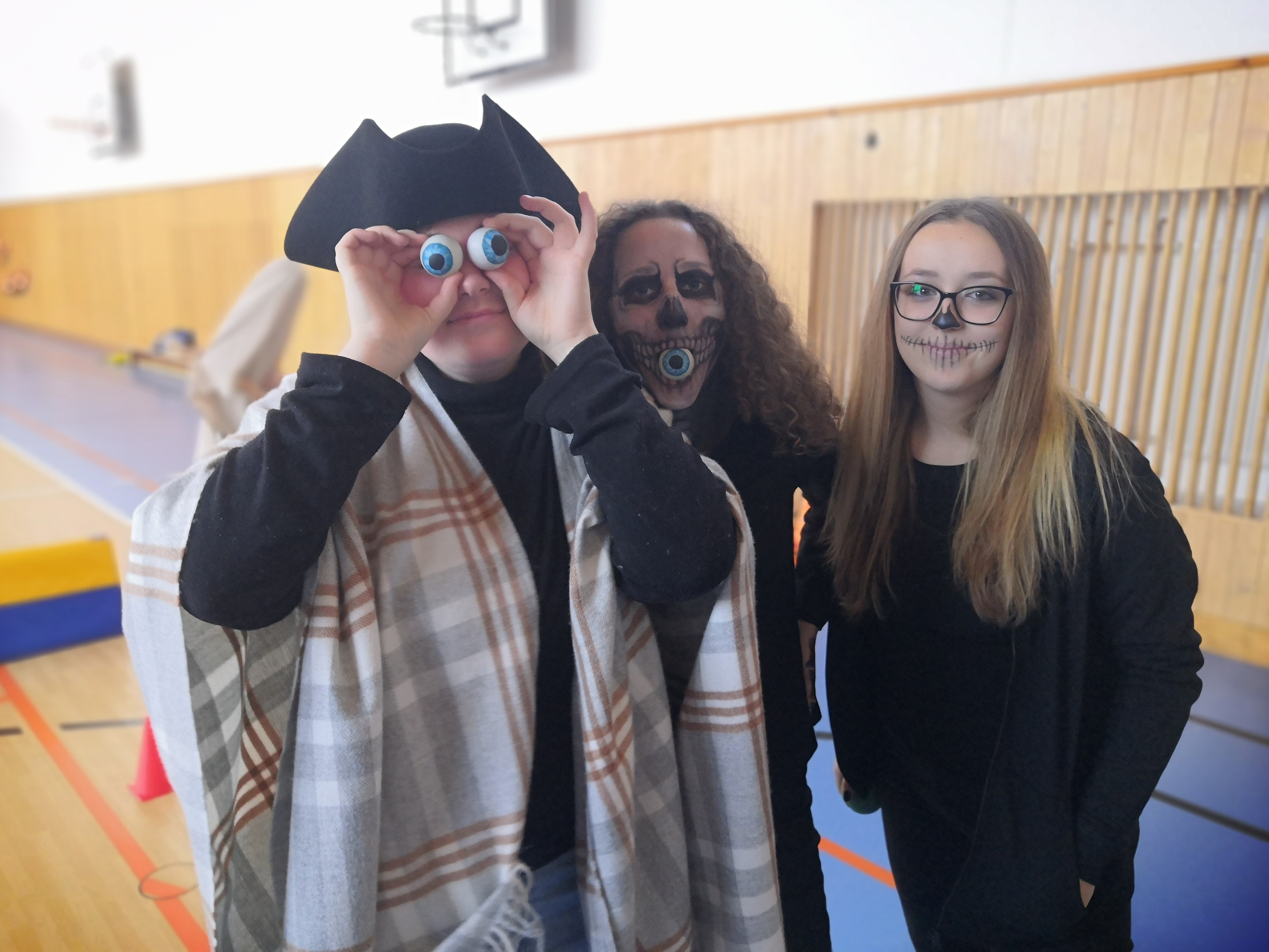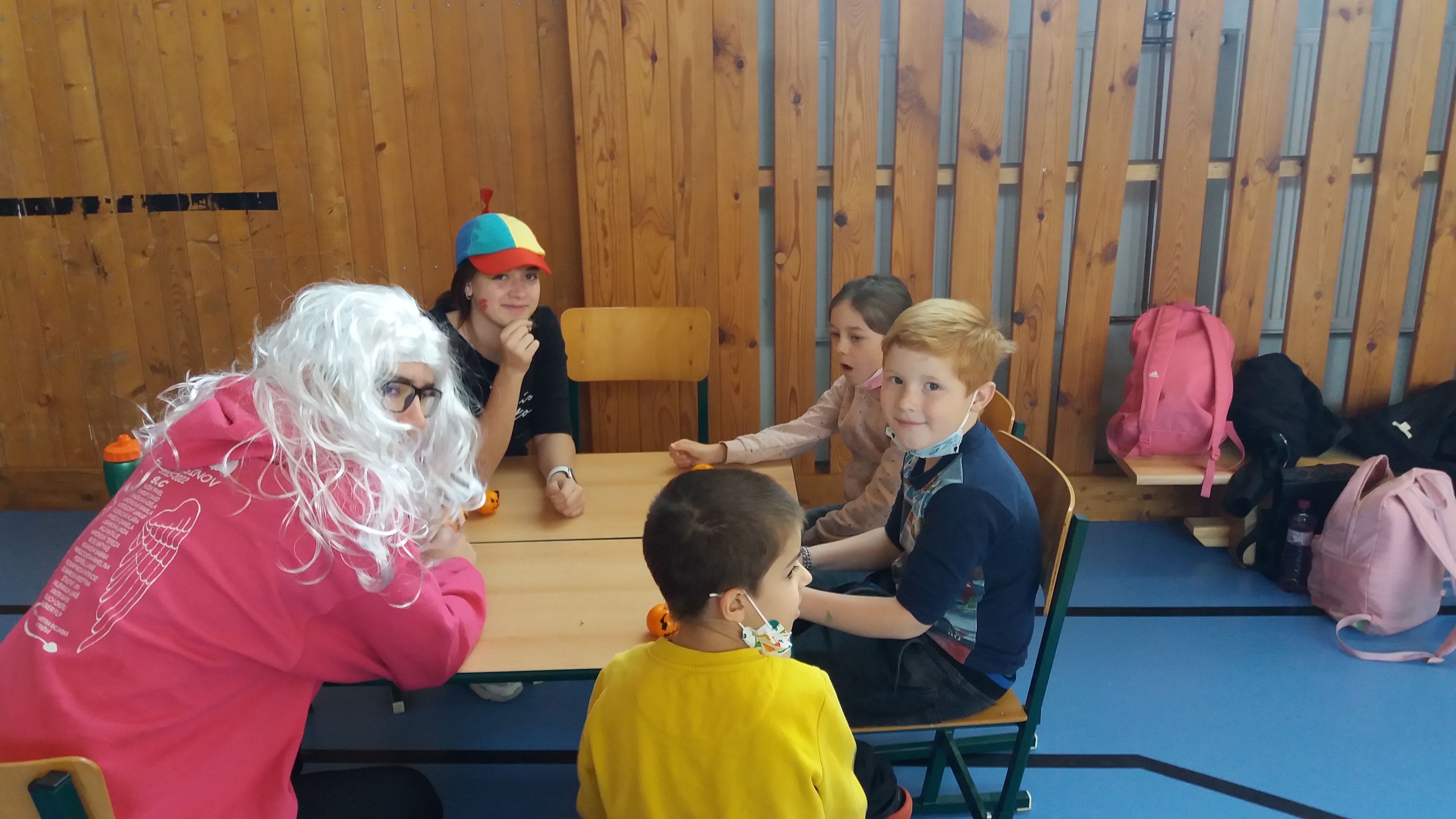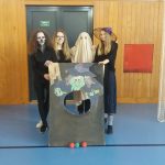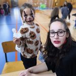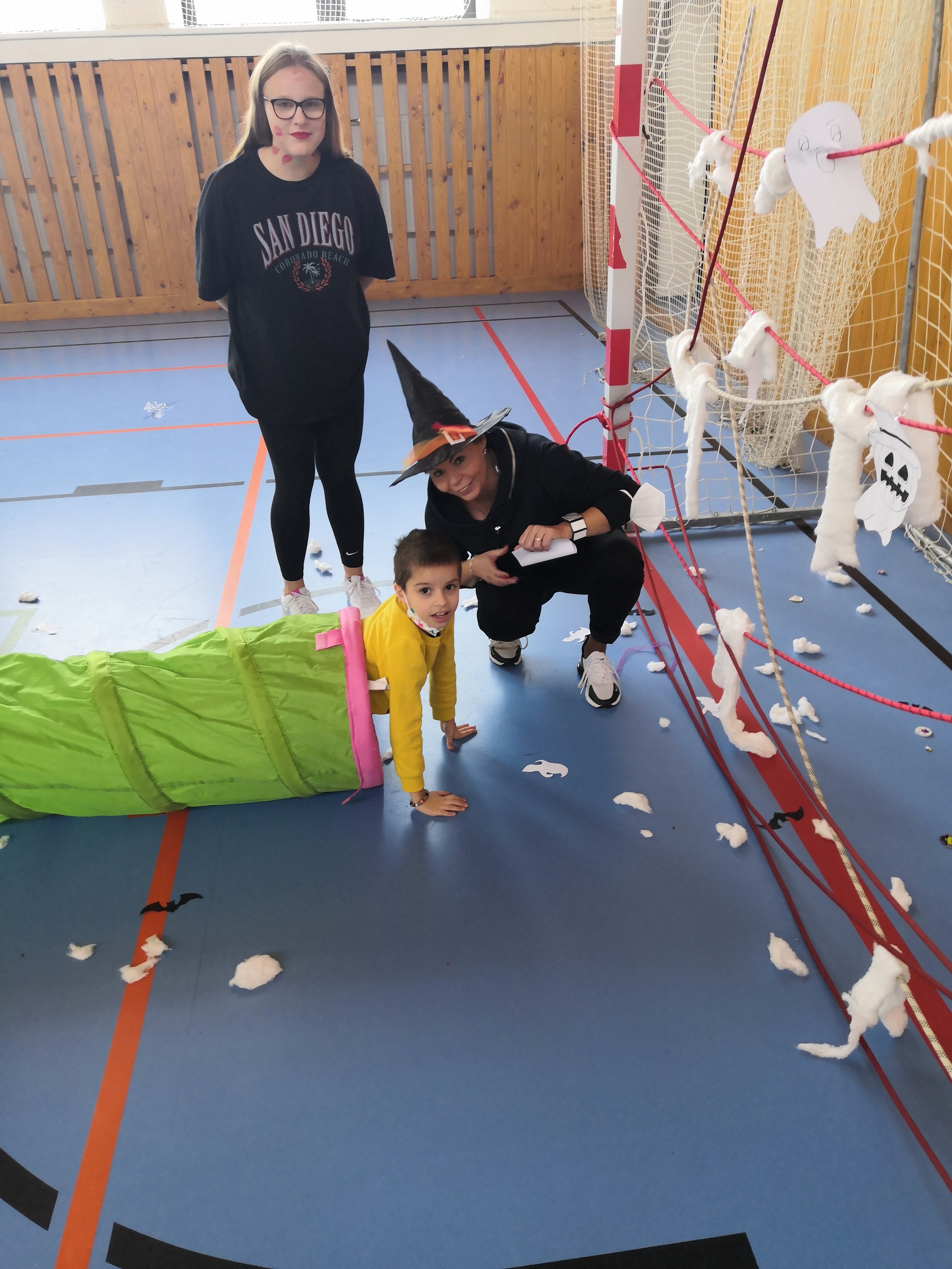 V tělocvičně jsme si nachystali vše potřebné a v 8:00 se již dostavila třída 1.A, všechny tři první třídy se v tělocvičně postupně vystřídaly. Prvňáci chodili s „okem“ na lžičce slalom, absolvovali opičí dráhu s koštětem, házeli míčky do pusy čarodějnici, lovili strašidelné živočichy (pavouky, krysy a hady) z tajuplných krabic, vymalovávali si halloweenské obrázky a vyráběli duchy z lízátek, prolézali pavučinou, zdobili mandarinky (jakoby malé dýně) a mohli si nechat něco namalovat na obličej. Vypadalo to, že si společně strávený čas užívají jak prvňáci, tak deváťáci.