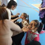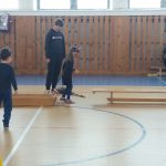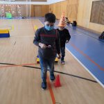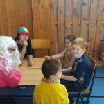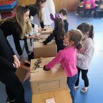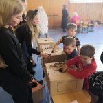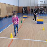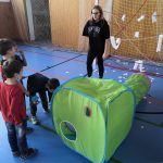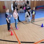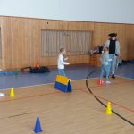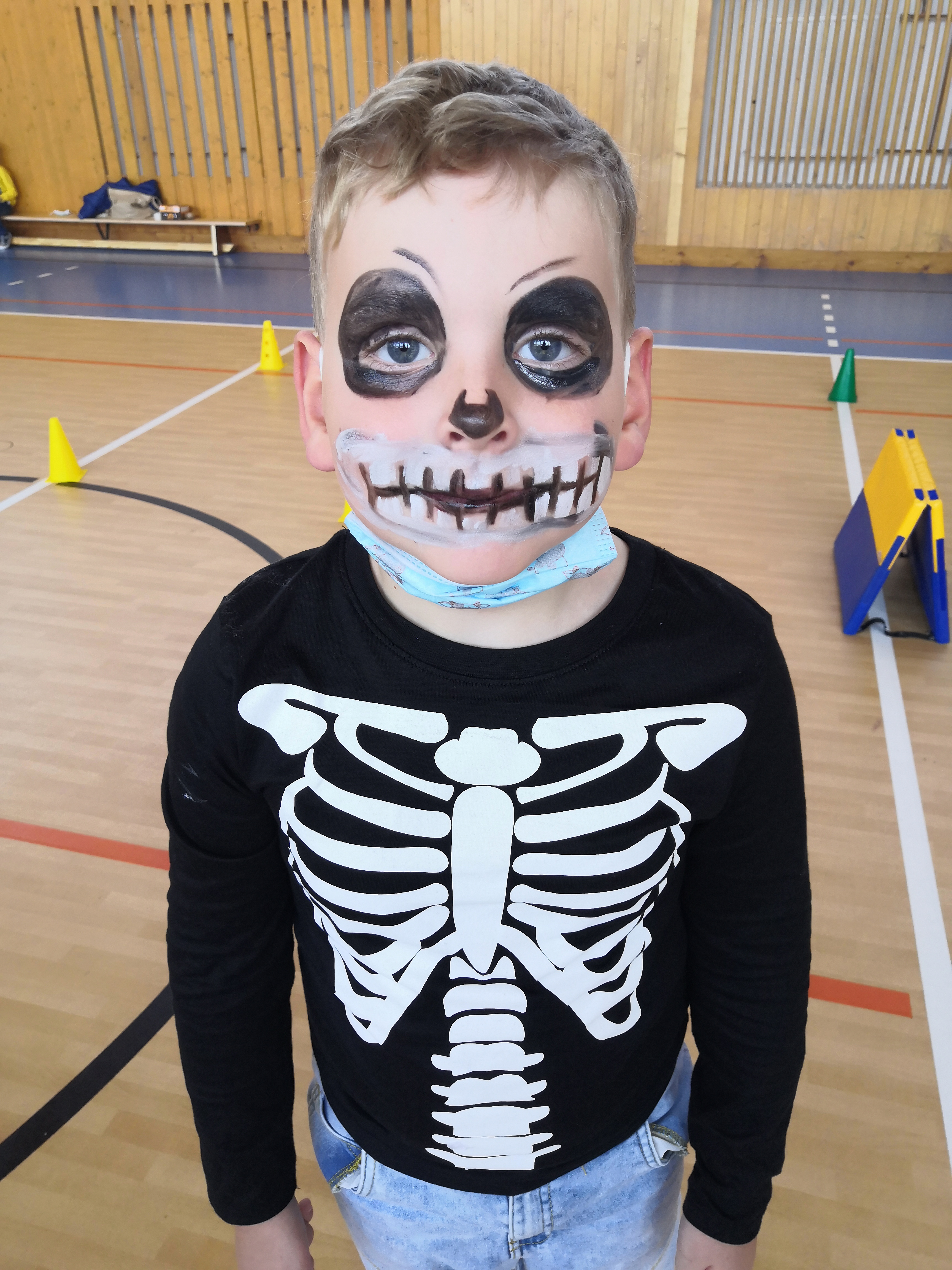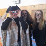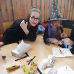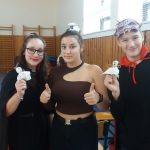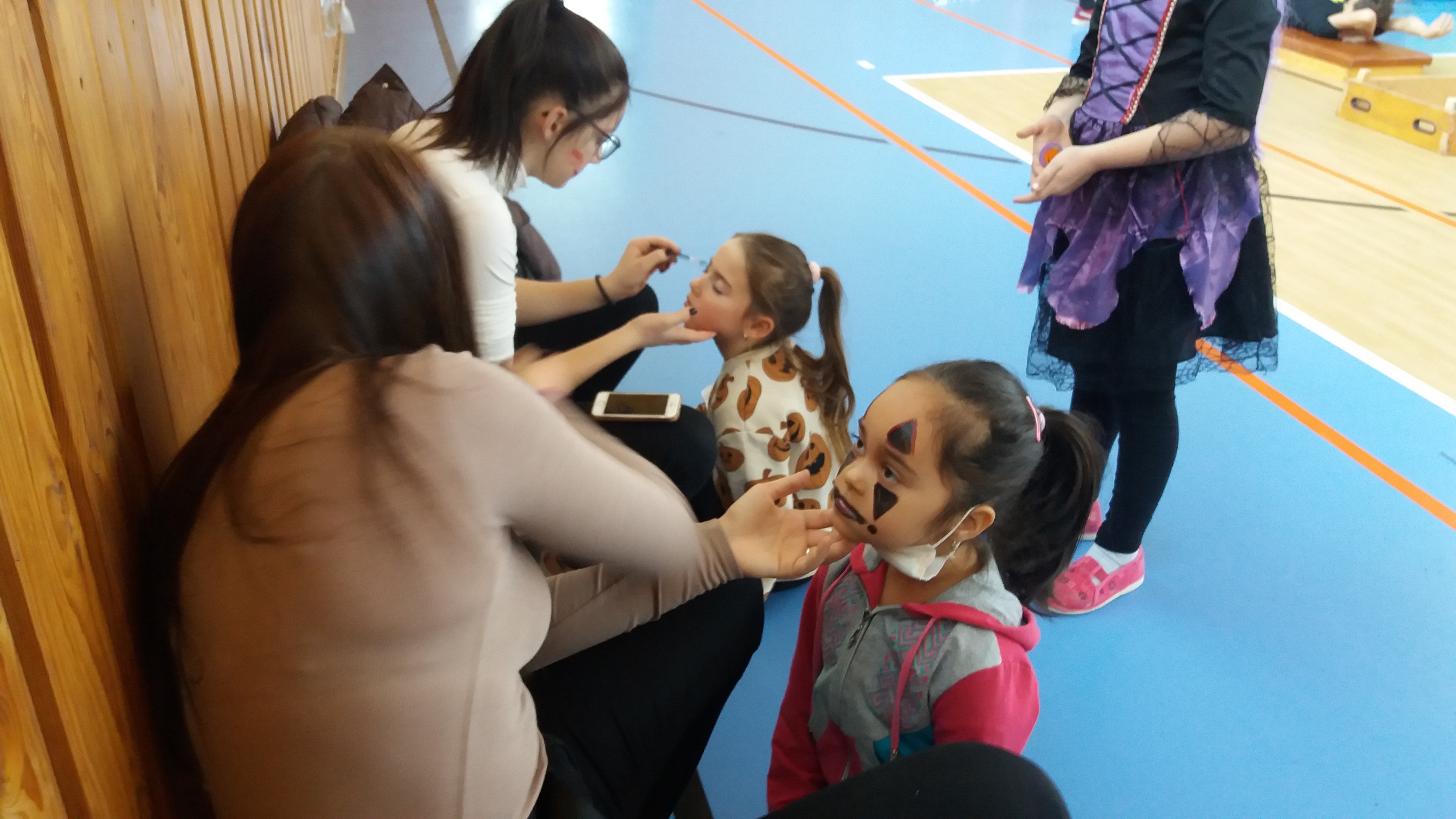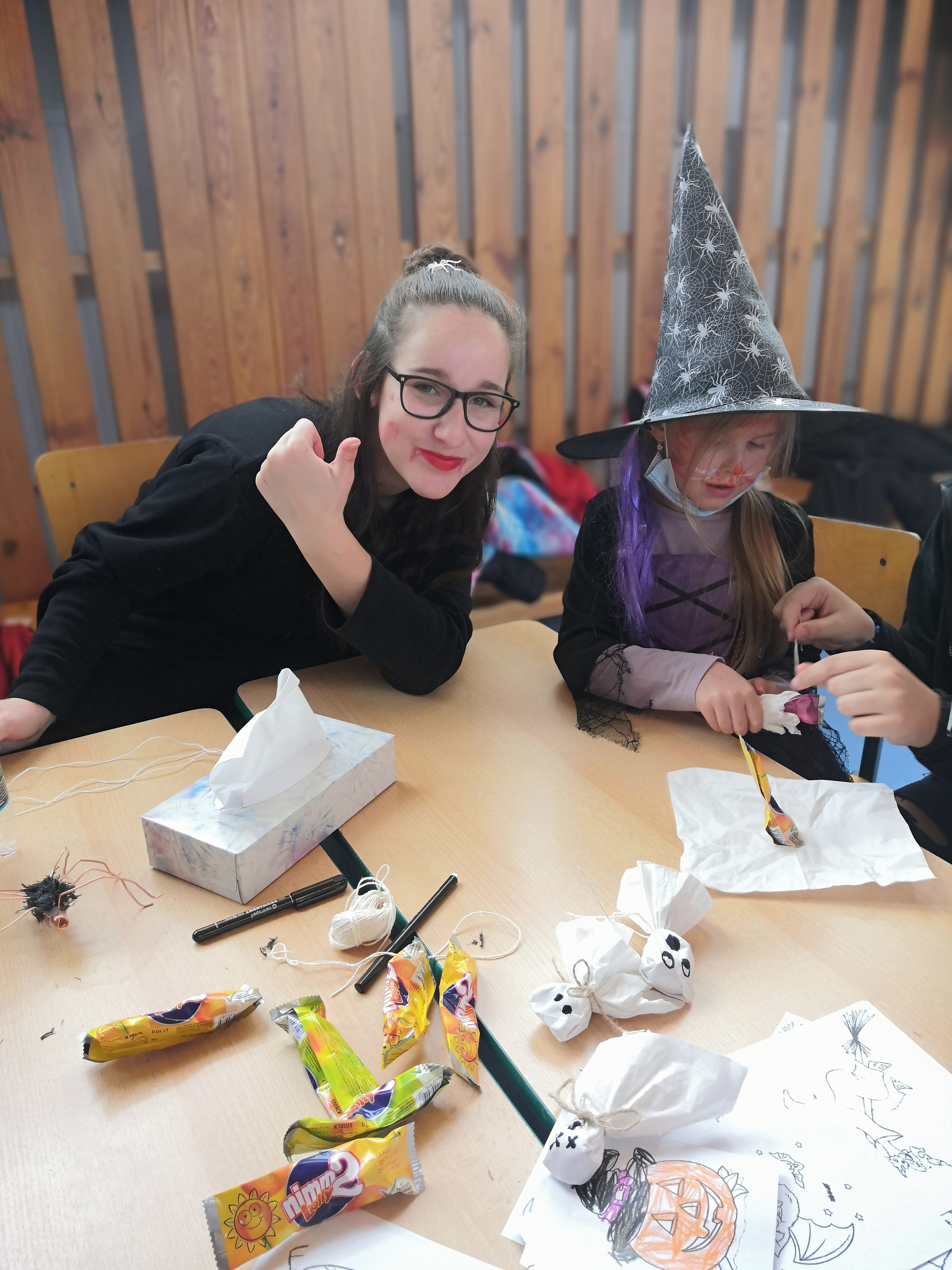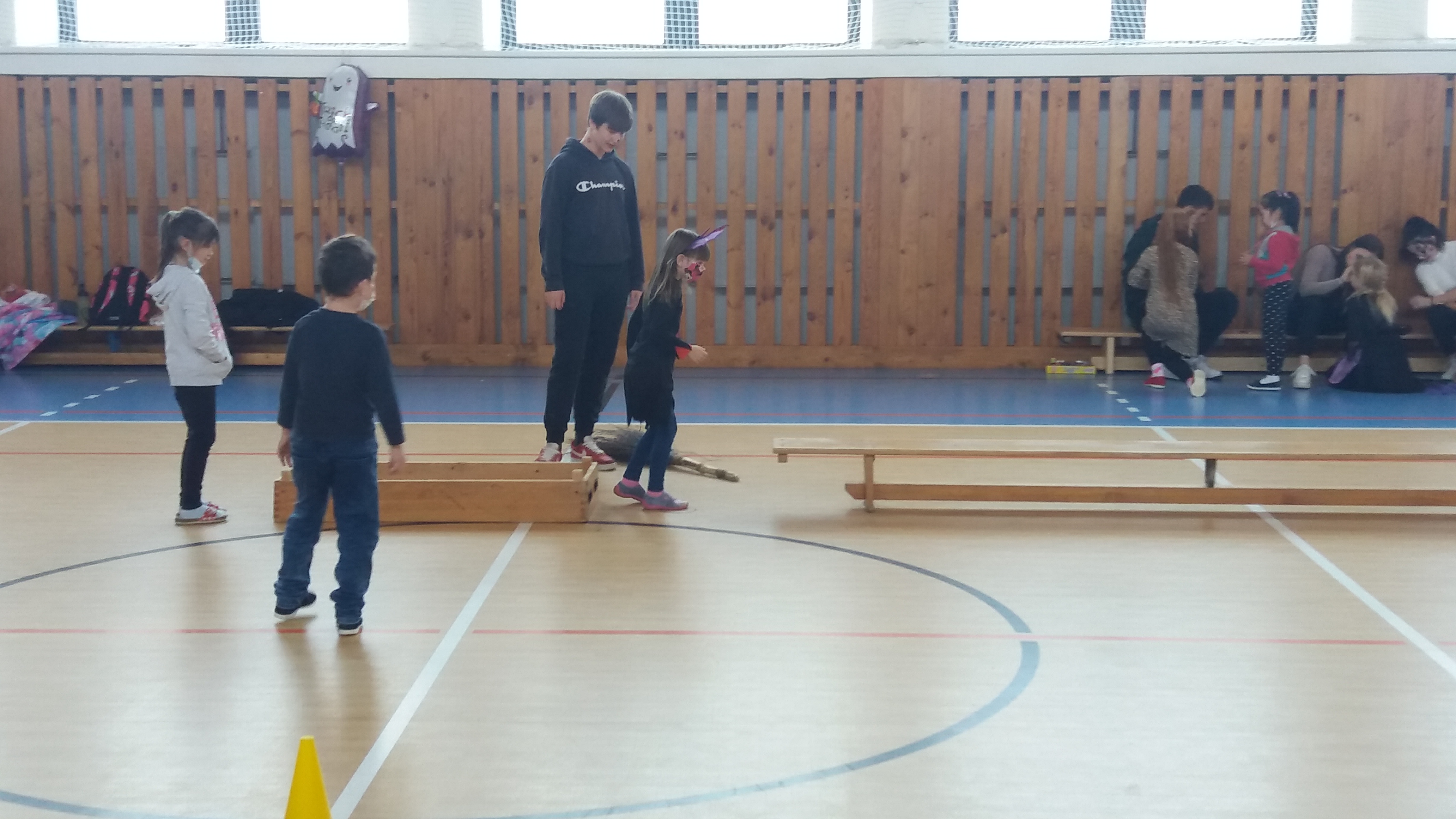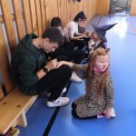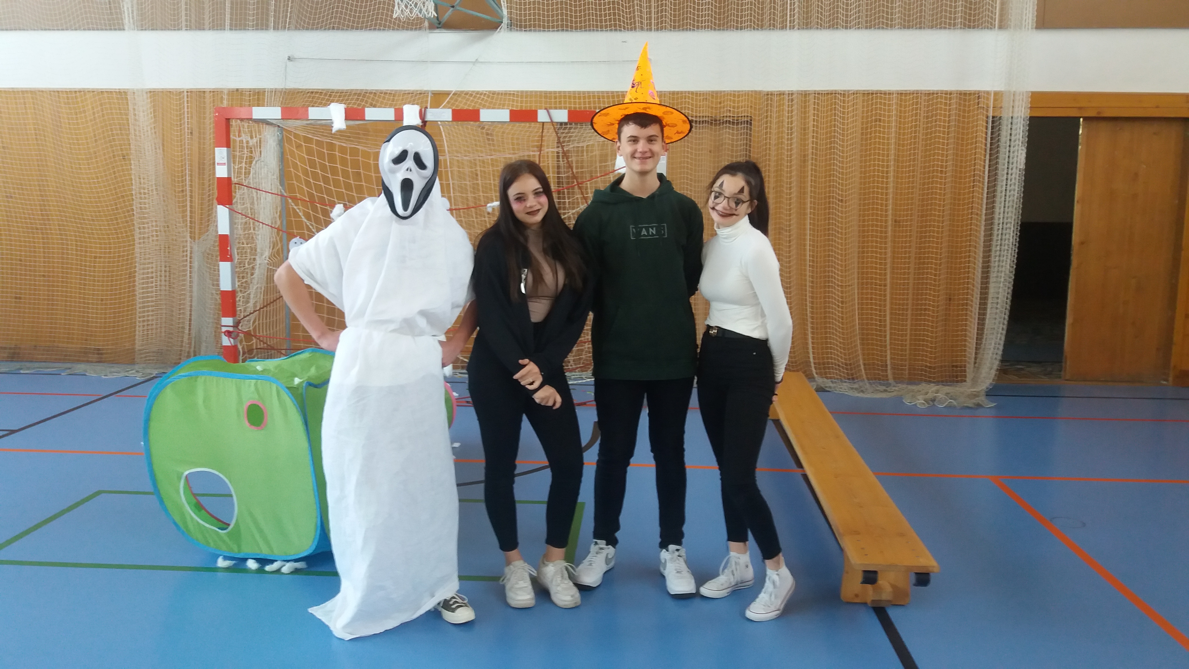V tělocvičně jsme si nachystali vše potřebné a v 8:00 se již dostavila třída 1.A, všechny tři první třídy se v tělocvičně postupně vystřídaly. Prvňáci chodili s „okem“ na lžičce slalom, absolvovali opičí dráhu s koštětem, házeli míčky do pusy čarodějnici, lovili strašidelné živočichy (pavouky, krysy a hady) z tajuplných krabic, vymalovávali si halloweenské obrázky a vyráběli duchy z lízátek, prolézali pavučinou, zdobili mandarinky (jakoby malé dýně) a mohli si nechat něco namalovat na obličej. Vypadalo to, že si společně strávený čas užívají jak prvňáci, tak deváťáci.