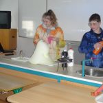 Za doprovodu filmové hudby z Bradavic náš malý, laboratorní tým představili Vojta s Ondrou a pak už se šlo směle na pokusy. Pro vstup do světa kouzel si Saša s hlavní hvězdou Ráďou, vybrali Bengálské ohně a nebezpečnou vodíkovou plechovkou Bombarda maxima. Zpočátku s námi malí žáci moc nekomunikovali, byli trochu vyjukaní, ale po chvilce se otrkali a sem tam něco zašpitli či se zasmáli. Po klucích šly na řadu Áňa s Verčou. Nejprve probudily Džina v konvi, díky kterému jsme si mohli pomyslet přání, které se určitě všem vyplní. A neméně zajímavá byla v jejich podání tryskající Amoniaková fontána. Pak přišel na řadu opět Saša, ale tentokrát ve dvojici s Michalem. Předvedli nám zrození cukrového baziliška, slimáka vyrobeného z lepidla a bezpečné sušení kapesníku nebo ponožek plamenem. To se teď v zimě může hodit! Následovala Katka s Michalem, který tentokrát zaskočil za nemocnou Marlen a ukázali nám skvělý trik – zapálení ohně za pomoci kapky vody a pak jak se míchá ve světě kouzel česká vlajka. Předposlední v řadě kouzel jsem byla já. Vyrobila jsem pro přítomné Mnoholičný lektvar, ale ve skutečnosti to byla jen obyčejná sloní pasta. Že nevíte, jak vypadá? Tak se podívejte na fotky, určitě ji tam najdete. A nakonec přišli Vojta s Ondrou. Ti nám ukázali oblíbenou zábavu žáků z Bradavic a to bylo skoro opravdické řezání, při němž nám předvedl i své skvělé herecké schopnosti omdlévající Ondra. A ta jejich kouzelná hůlka! Dokázala proměnit vodu ve víno, samozřejmě doplněná správným zaklínadlem, ale to nebudu prozrazovat, protože by tomu nikdo, kdo je mudlovské krve stejně nerozuměl. Nejlepší pokus samozřejmě přišel až nakonec. Byla to ohnivá klouzačka, tak tomu alespoň říkám já. Napoprvé to sice nebylo nic moc, ale na druhý pokus se to povedlo až moooc dobře. A tímto efektním pokusem se naše představení také uzavřelo.