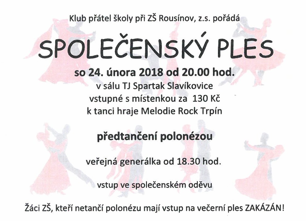 Tradiční Školní společenský ples ZŠ Rousínov se koná v sobotu 24. února 2018 v sálu TJ Spartak Slavíkovice. Ples bude zahájen ve 20.00 hodin předtančením polonézou žáků 9. ročníku.
