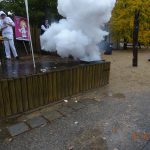 Navzdory prvnímu neúspěchu jsme s dobrou vírou pokračovaly na stanoviště fyziky. Tam jsme se dozvěděly něco o elektromotorech, solárních panelech a vozítku na vodík. Tentokrát jsme celkem s přehledem odpověděly na otázky, které jsme nedávno probíraly ve fyzice. A pak následoval malý výlet do zatuchlého terária s opičkami. Tam jsme se dozvěděly něco o čtvrtohorách a o tom, že už bychom se podle propočtů světových odborníků měli nacházet zase v době ledové. No, nebyl čas dumat nad cykly přírody , vybraly jsme odpovědi a hurá do nejzajímavější části soutěže s chemickými pokusy. O tom, co jsme tam viděly a zažily, si můžete přečíst v rozhovoru s našimi soutěžícími. Ale „šou“ to byla skvělá a třeba při pokusu s kapalným dusíkem v popelnici se pro diváky naplnilo heslo soutěže „Zachraň se, kdo můžeš!“ V samém závěru soutěže u výběhu s volavkami jsme si poslechly něco o organizaci WWF a ohrožených tvorech. Zbývalo jen naposledy zapsat odpovědi a…bylo dobojováno!